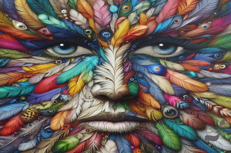 In this composition, color and texture converge into an awakening gaze — a reminder that beauty is born from life itself. The feathers breathe with stories of flight and freedom, of quiet strength and renewal. Through them, Aguiar celebrates the sacred connection between creation and creator, between what lives and what endures.