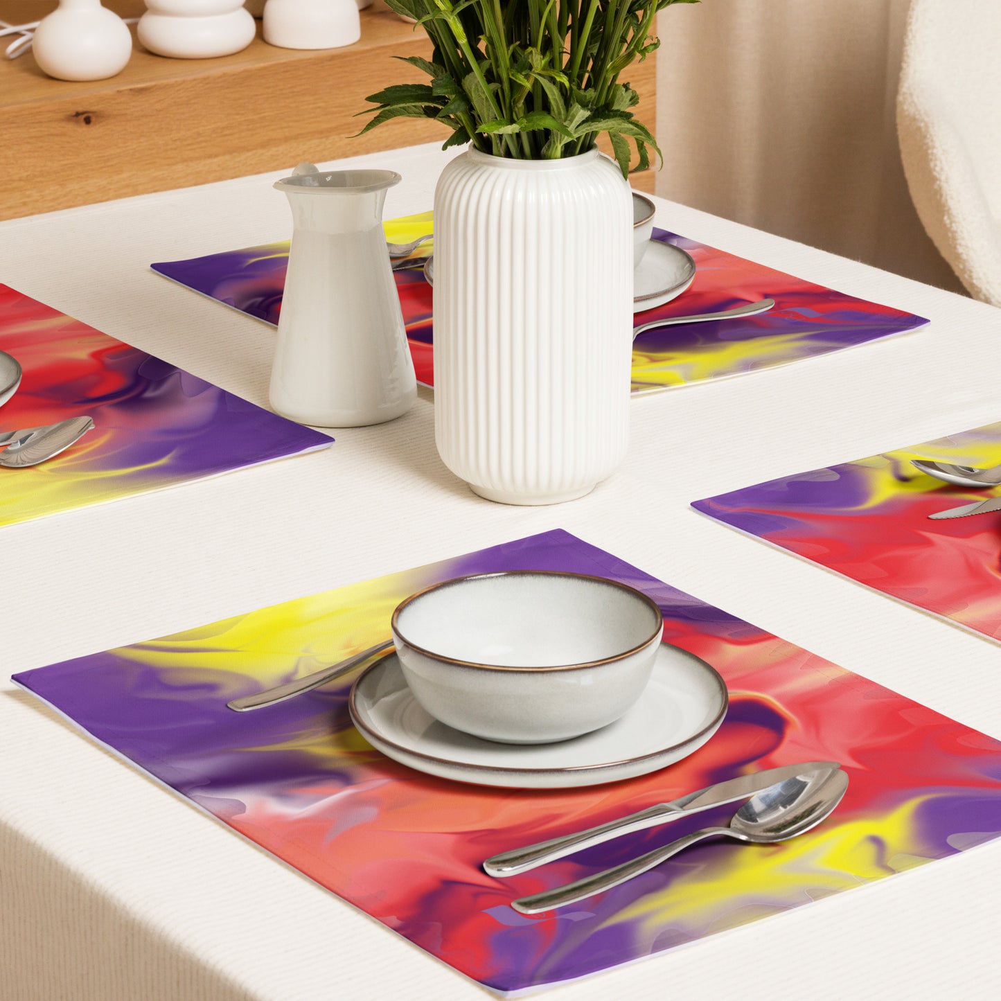 Bereniche Aguiar's abstract placemat set is not merely a functional addition but a statement piece for your dining space. Let the dynamic patterns and vivid colors breathe life into your meals, turning each dining occasion into a visual feast.