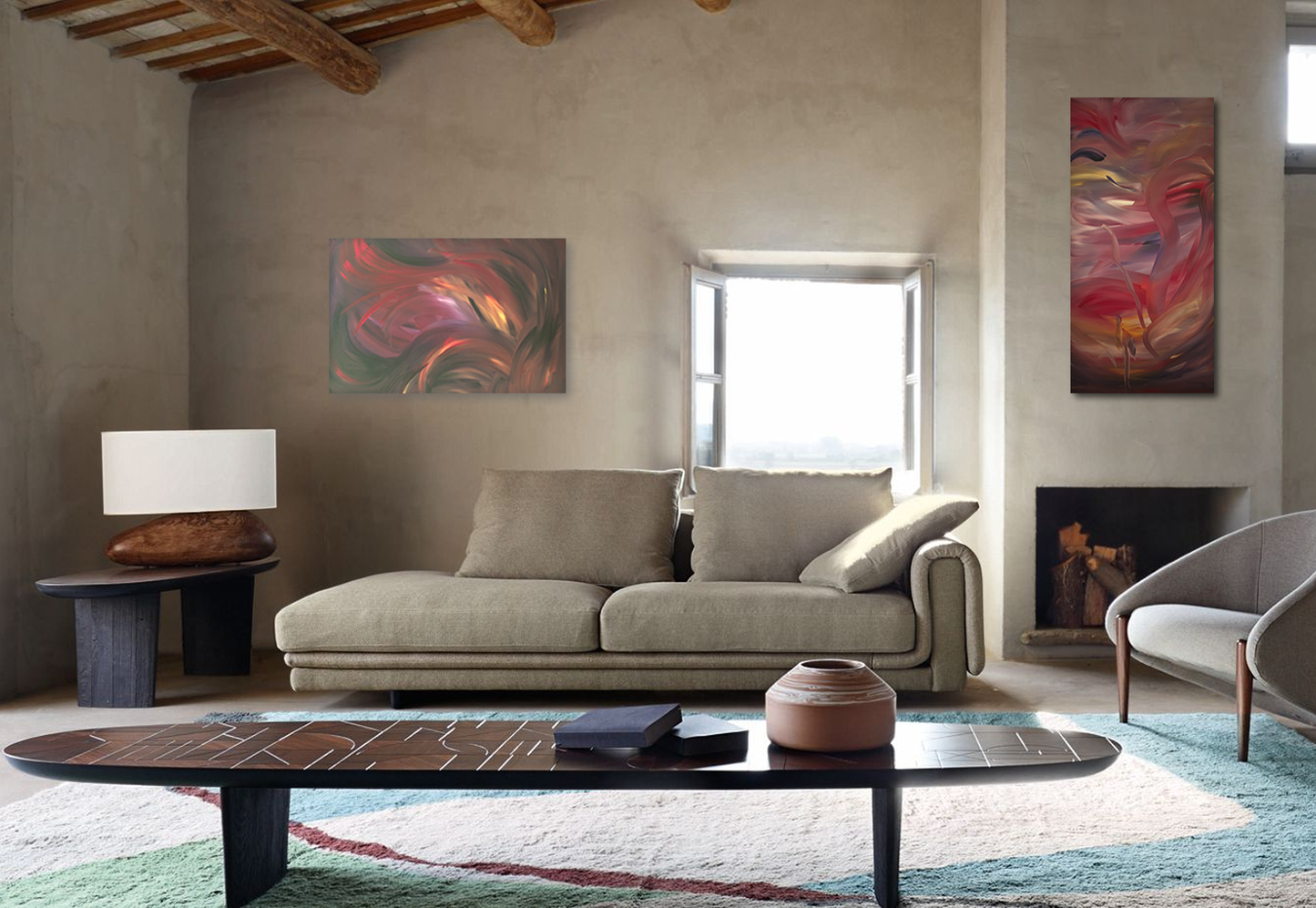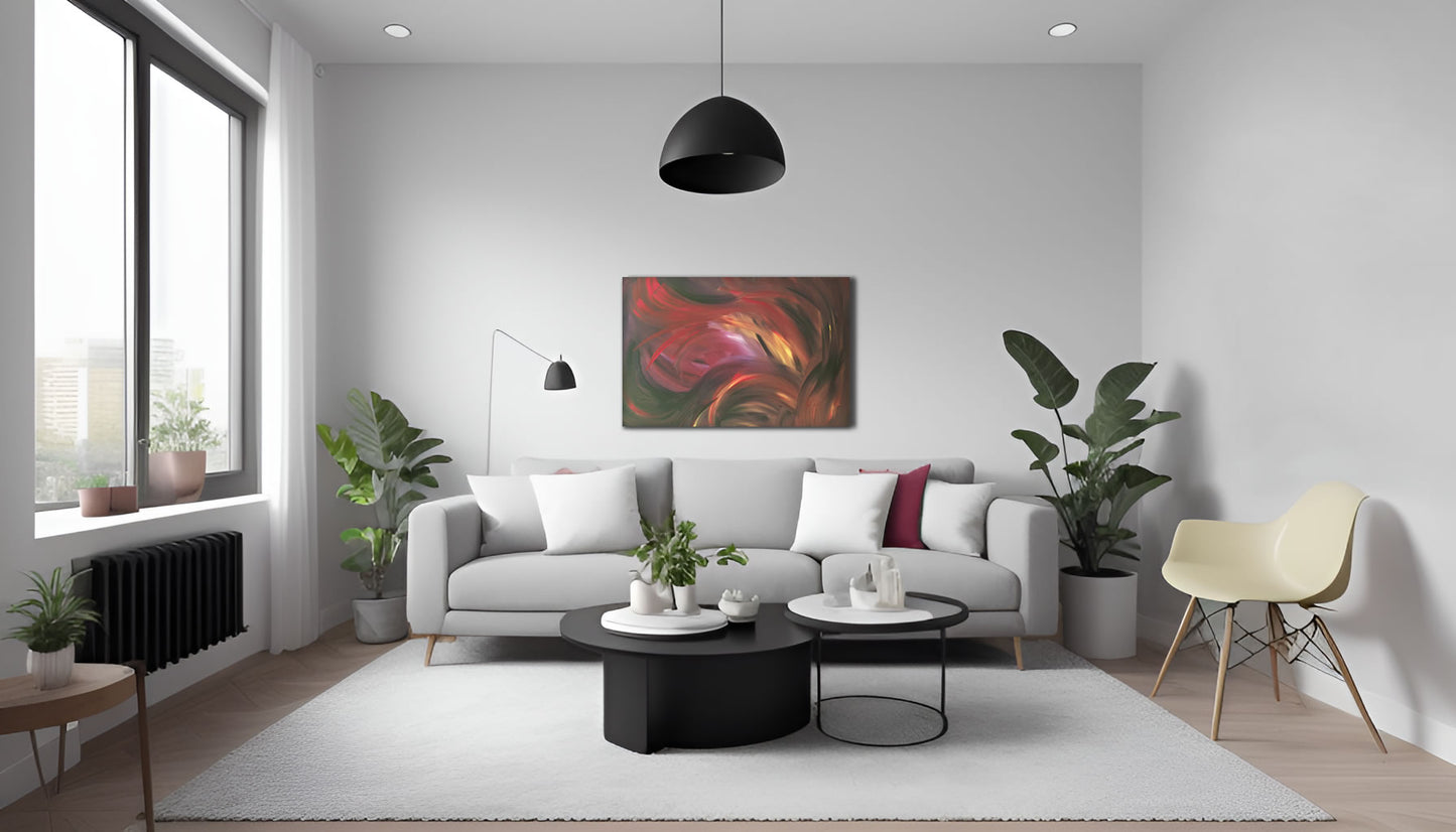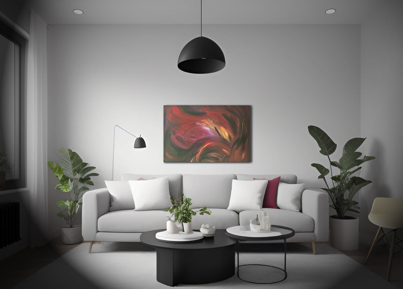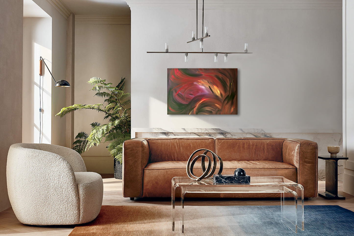 Fading Out is an original abstract expressionist masterpiece by Bereniche Aguiar, capturing the emotional moment where energy softens but never disappears. The composition glows with layers of deep reds, purples, golds, and soft whites, evoking the warmth and pulse of a fading flame.