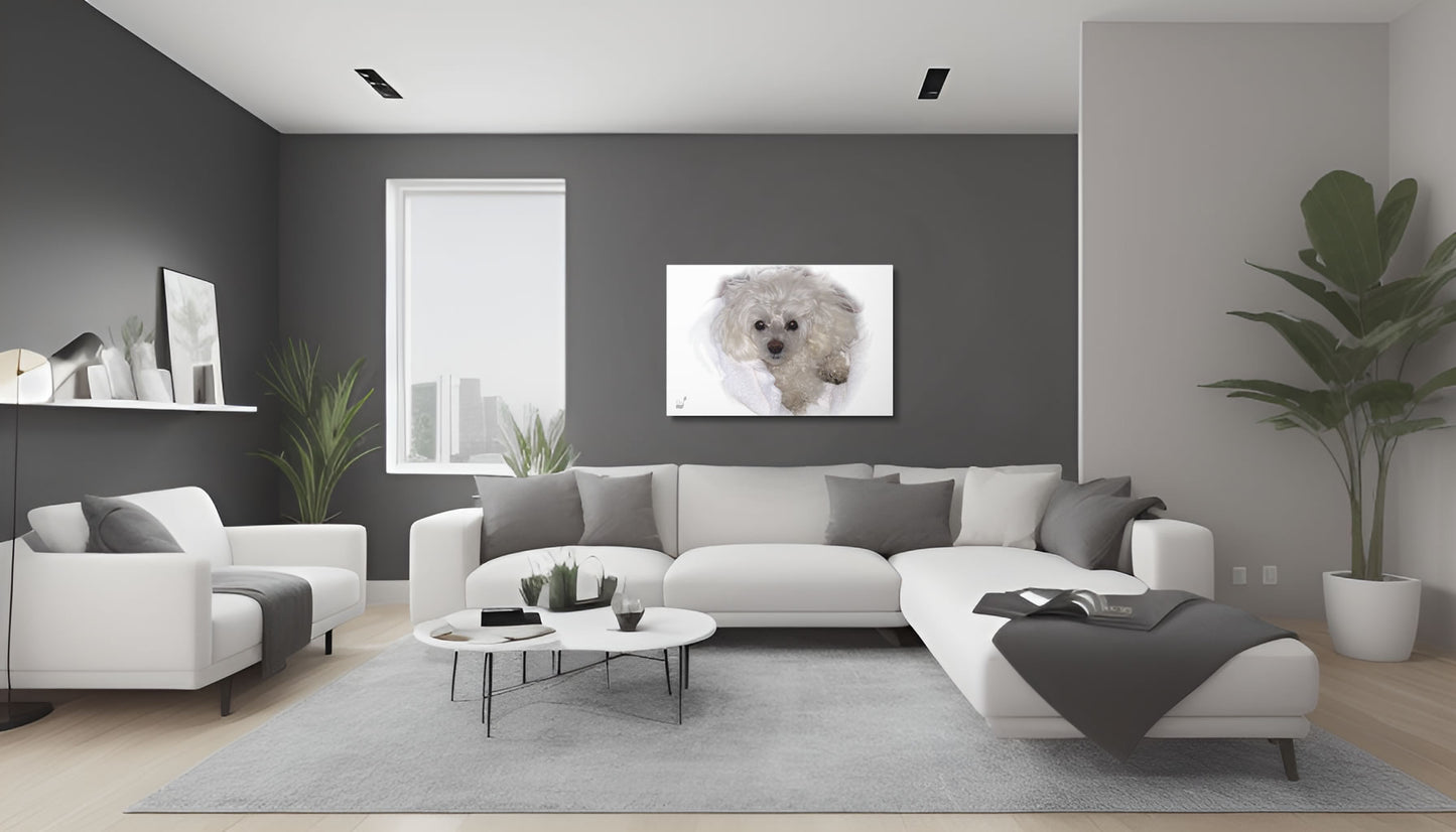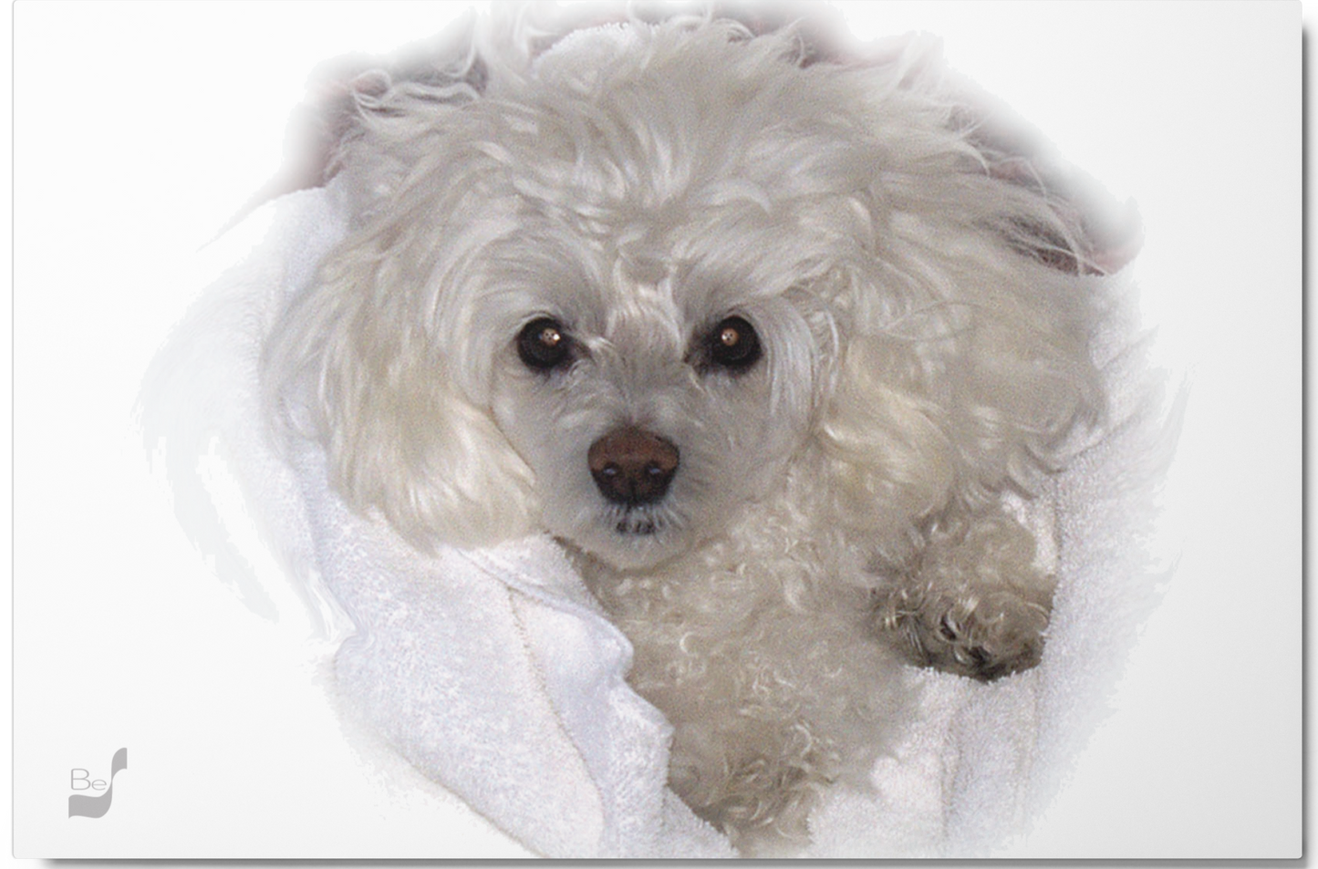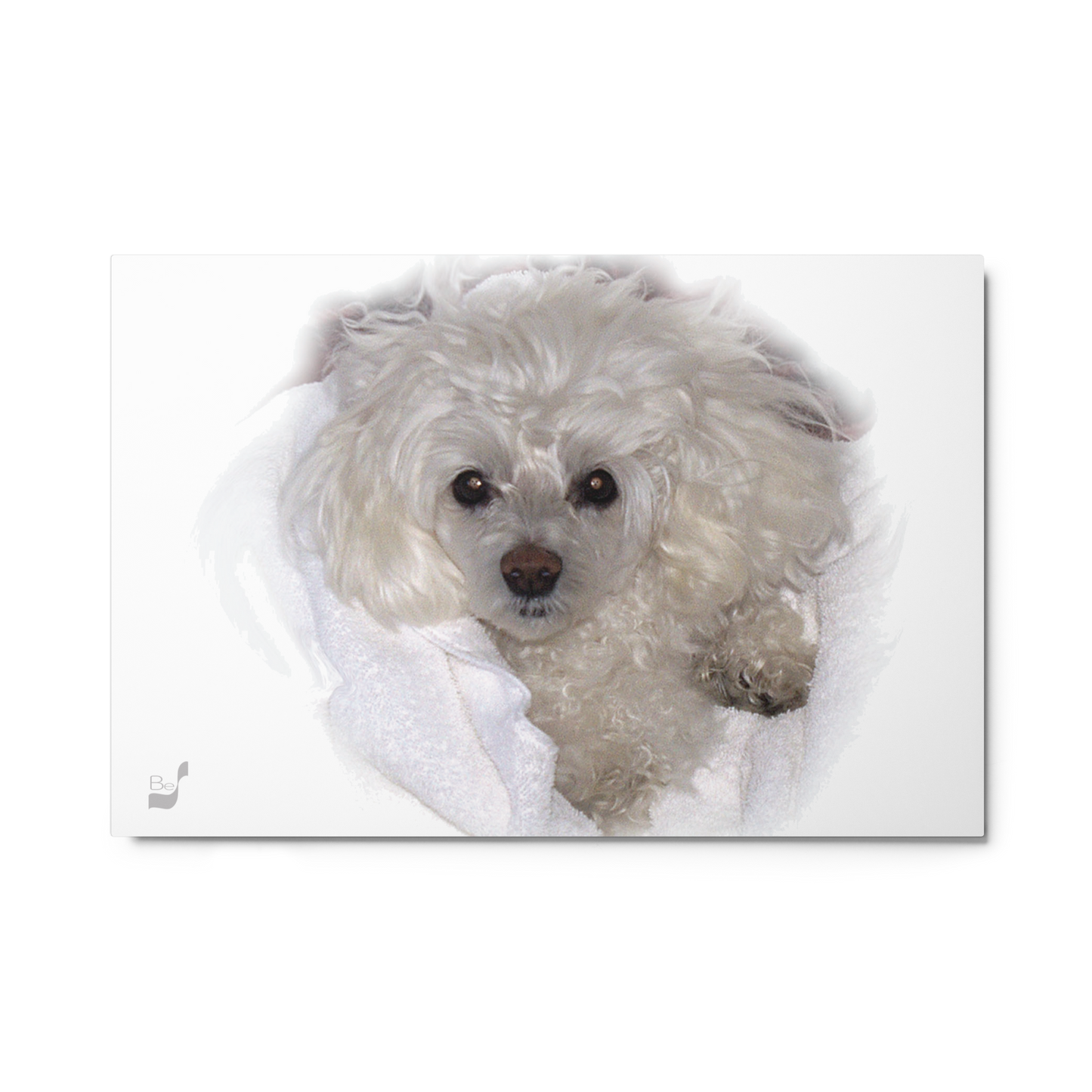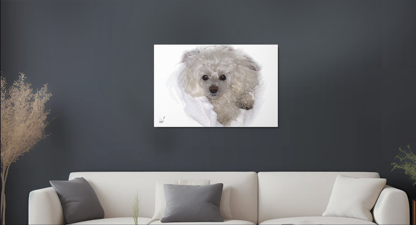 "Indulge in the elegance of 'Gaze with a Twist!' - a high-quality metal wall art showcasing a close-up portrait of Shootzy, the charming Bolognese dog. Transform your space with contemporary style and capture the hearts of dog lovers. Order now for lasting beauty and timeless allure!"
