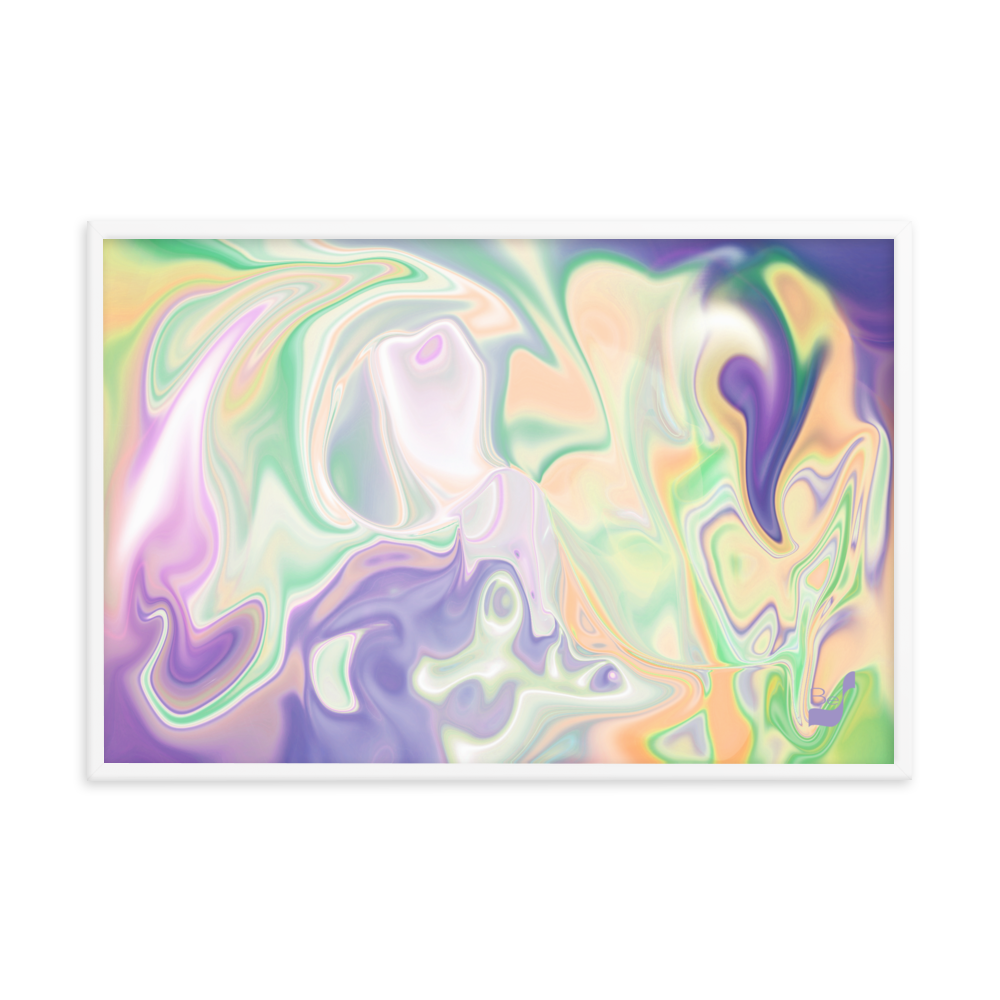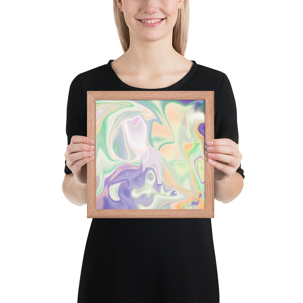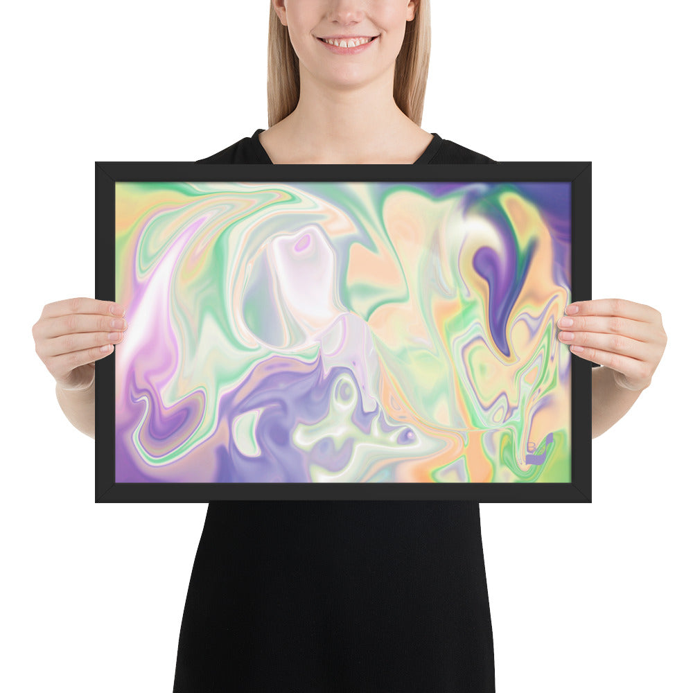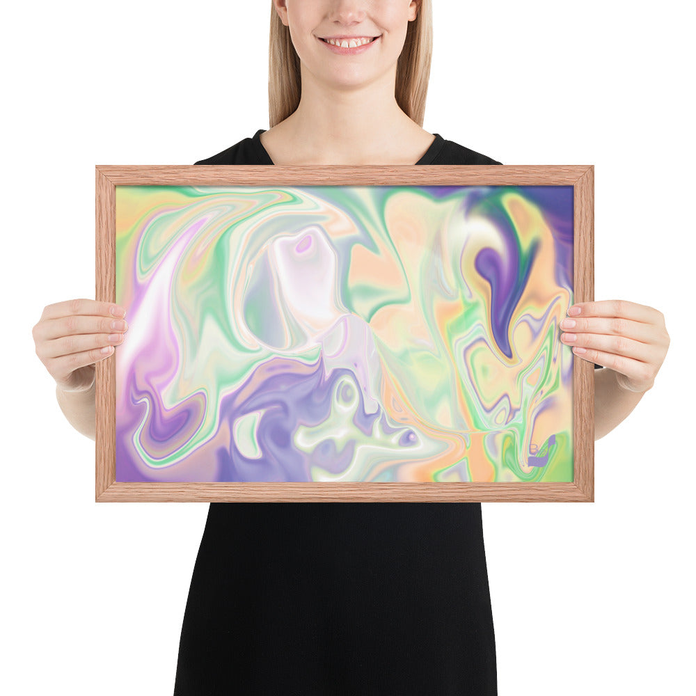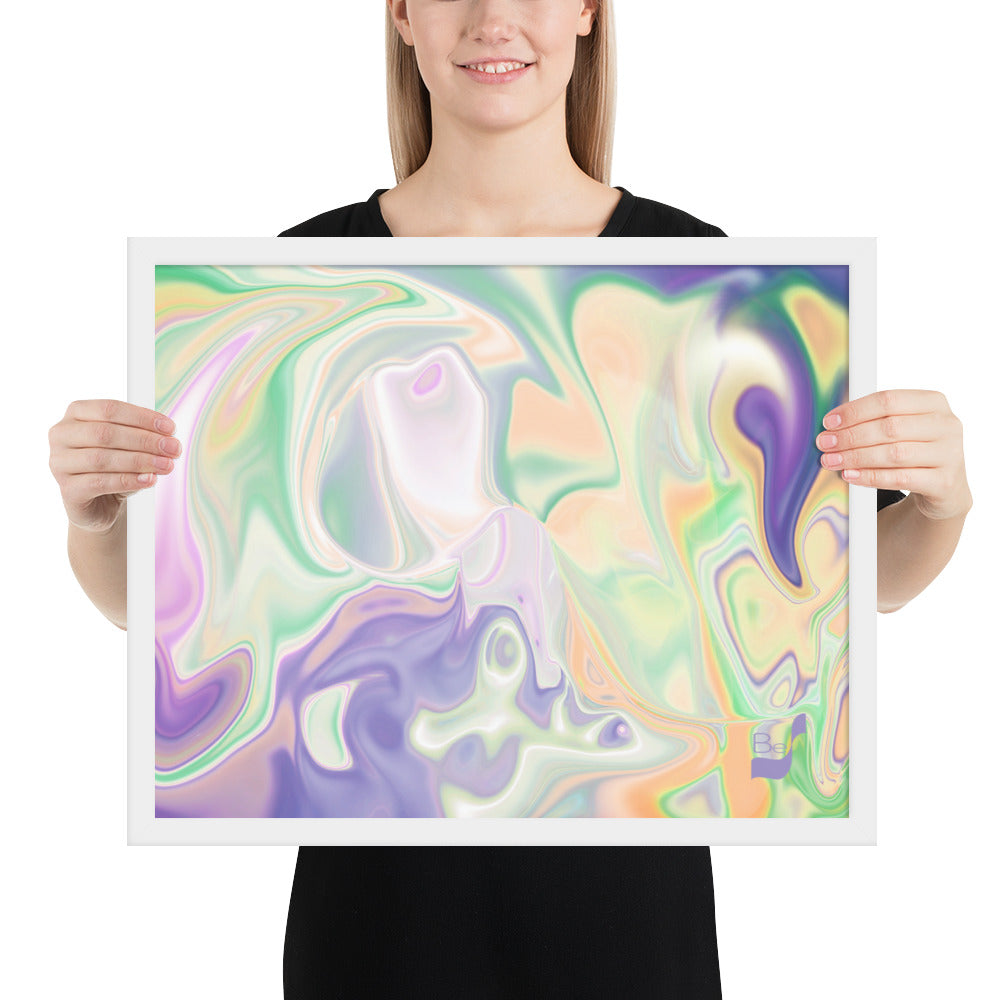 Enhance the allure of your home décor with this beautifully framed abstract art.  The heart of this stunning artwork lies in its captivating combination of colors. Ranging from soothing pastels to rich and deep tones, the colors beautifully intertwine with each other, creating an awe-inspiring visual feast. The carefully chosen colors – African Violet, Emerald, Green, Lavender, Light Green, Light Orange, Light Teal, Purple, and White – harmoniously dance together, elevating the ambiance of any room.