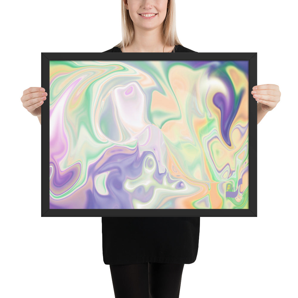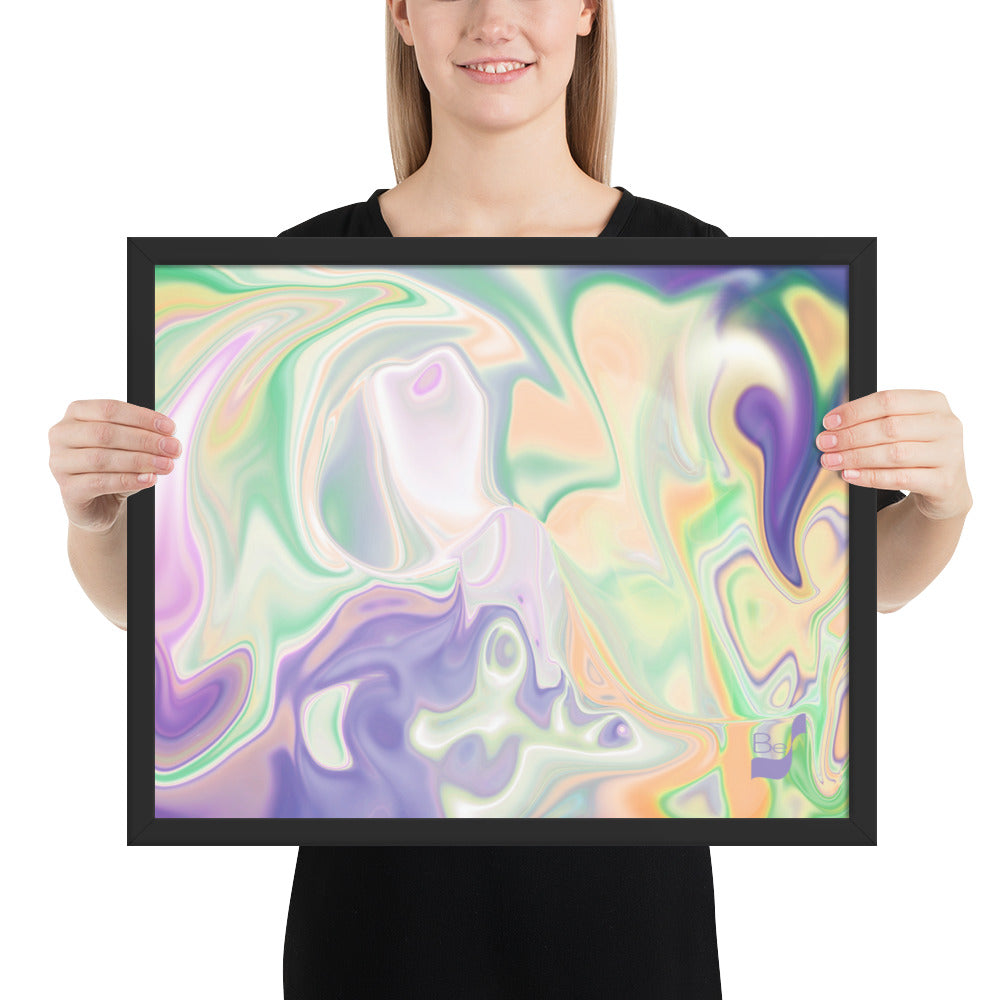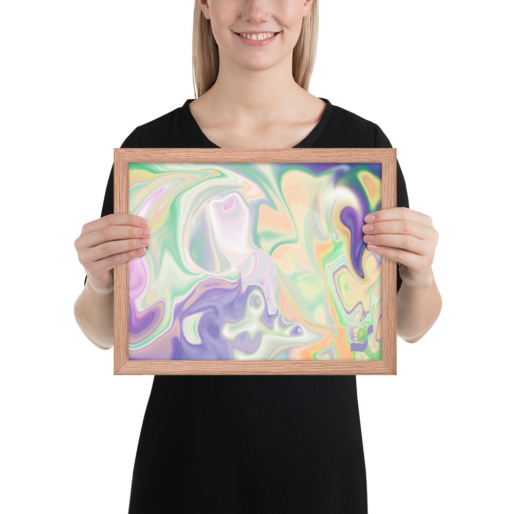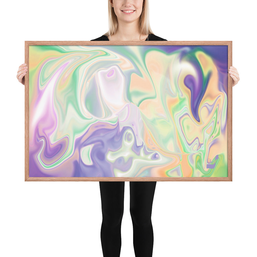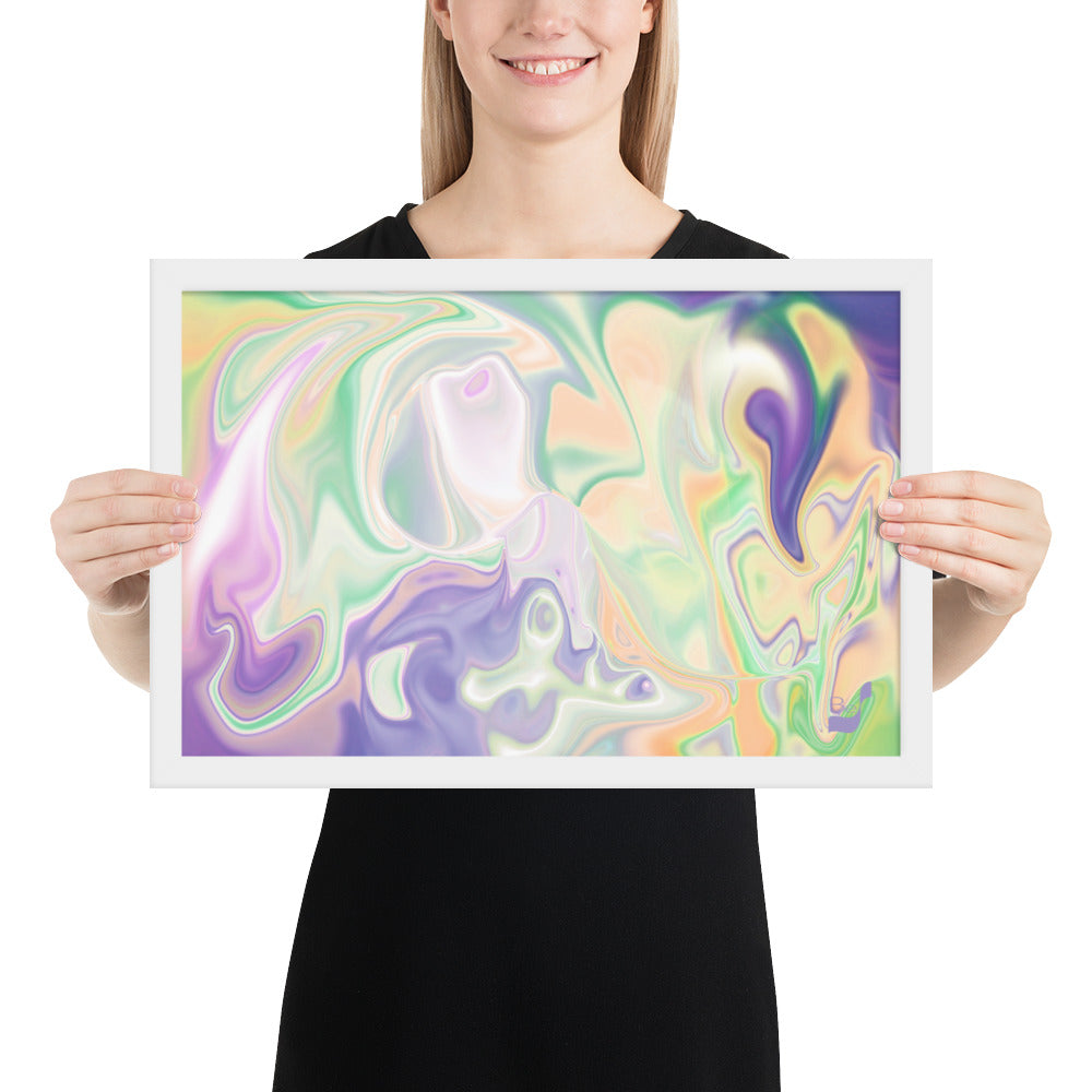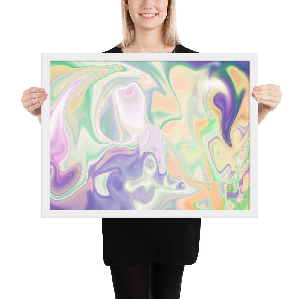 Enhance the allure of your home décor with this beautifully framed abstract art.  The heart of this stunning artwork lies in its captivating combination of colors. Ranging from soothing pastels to rich and deep tones, the colors beautifully intertwine with each other, creating an awe-inspiring visual feast. The carefully chosen colors – African Violet, Emerald, Green, Lavender, Light Green, Light Orange, Light Teal, Purple, and White – harmoniously dance together, elevating the ambiance of any room.