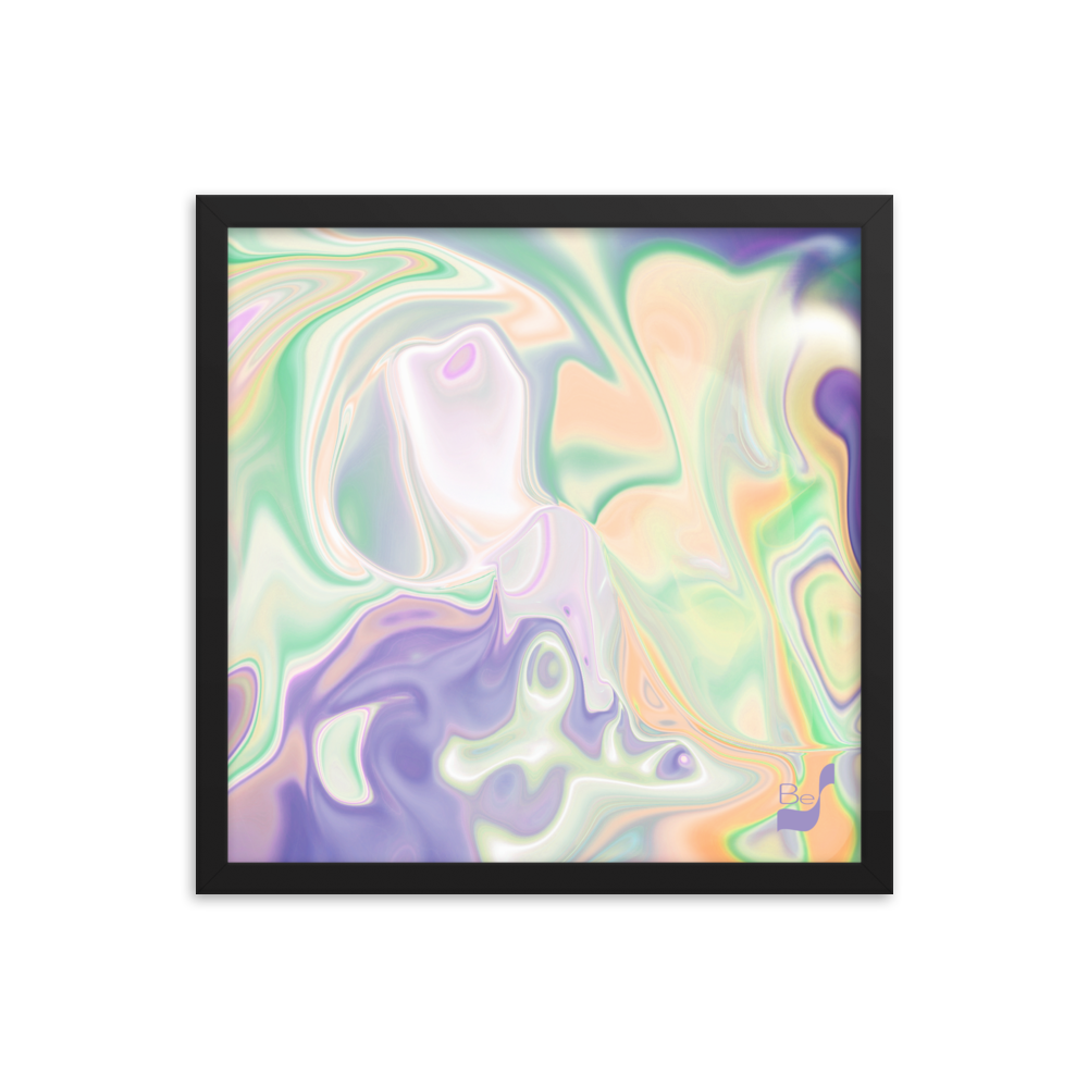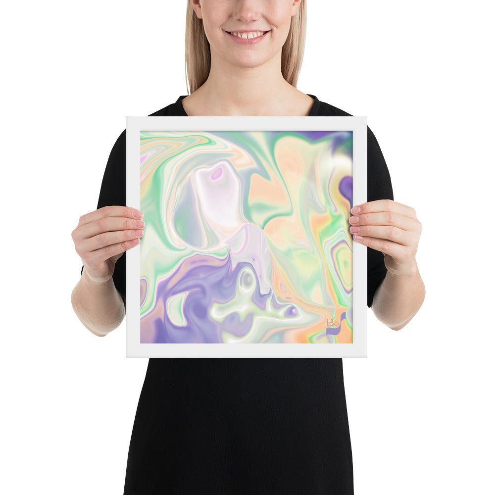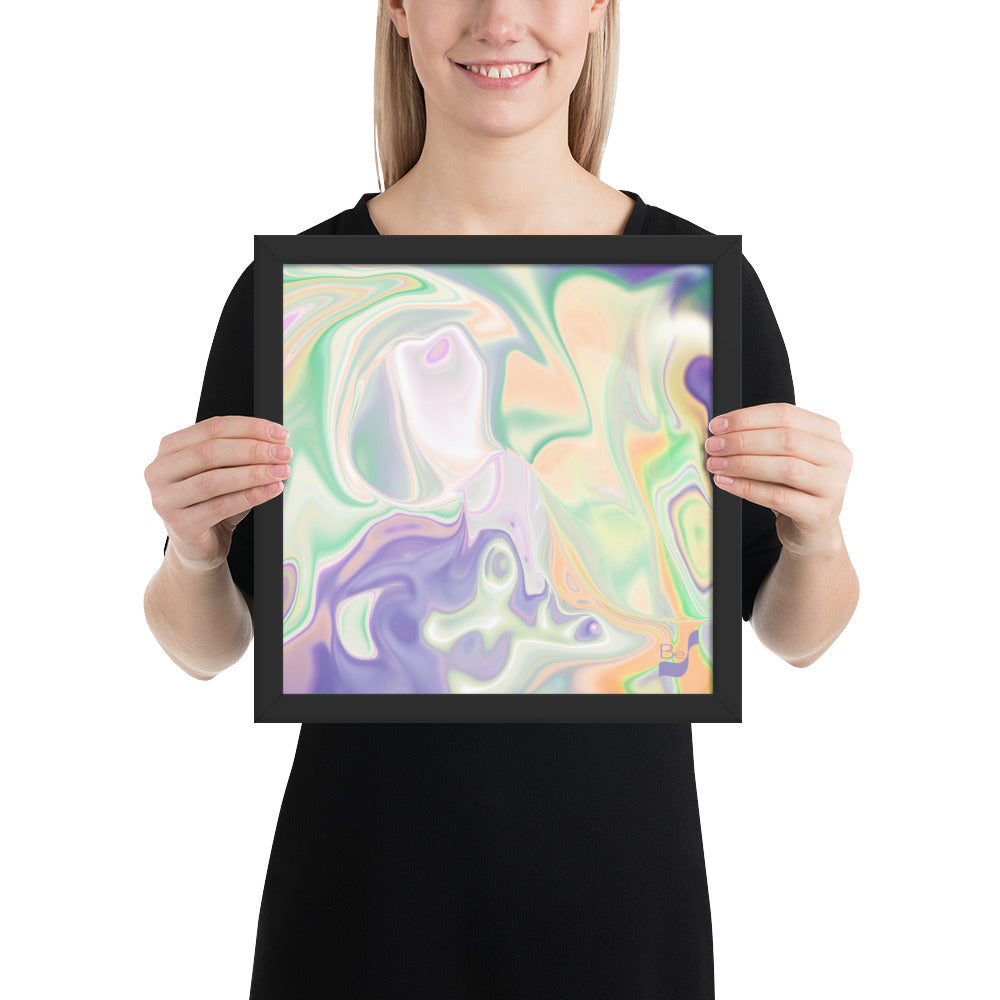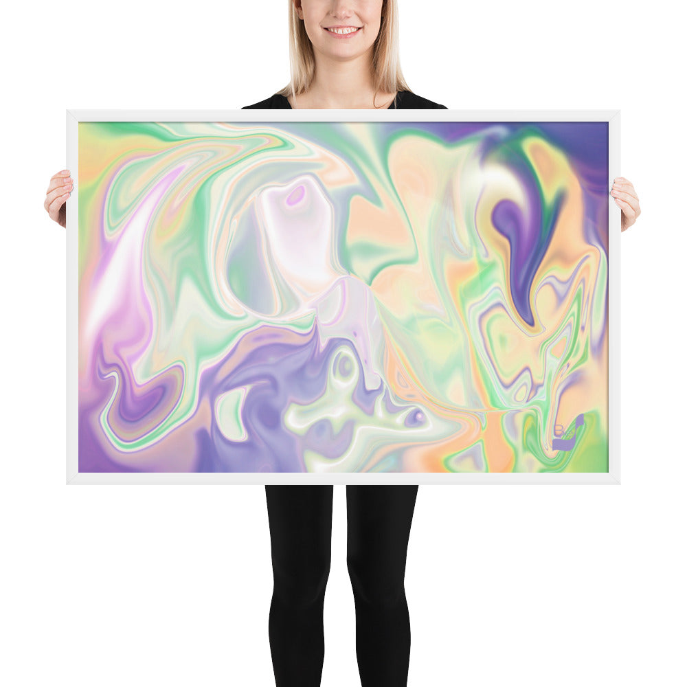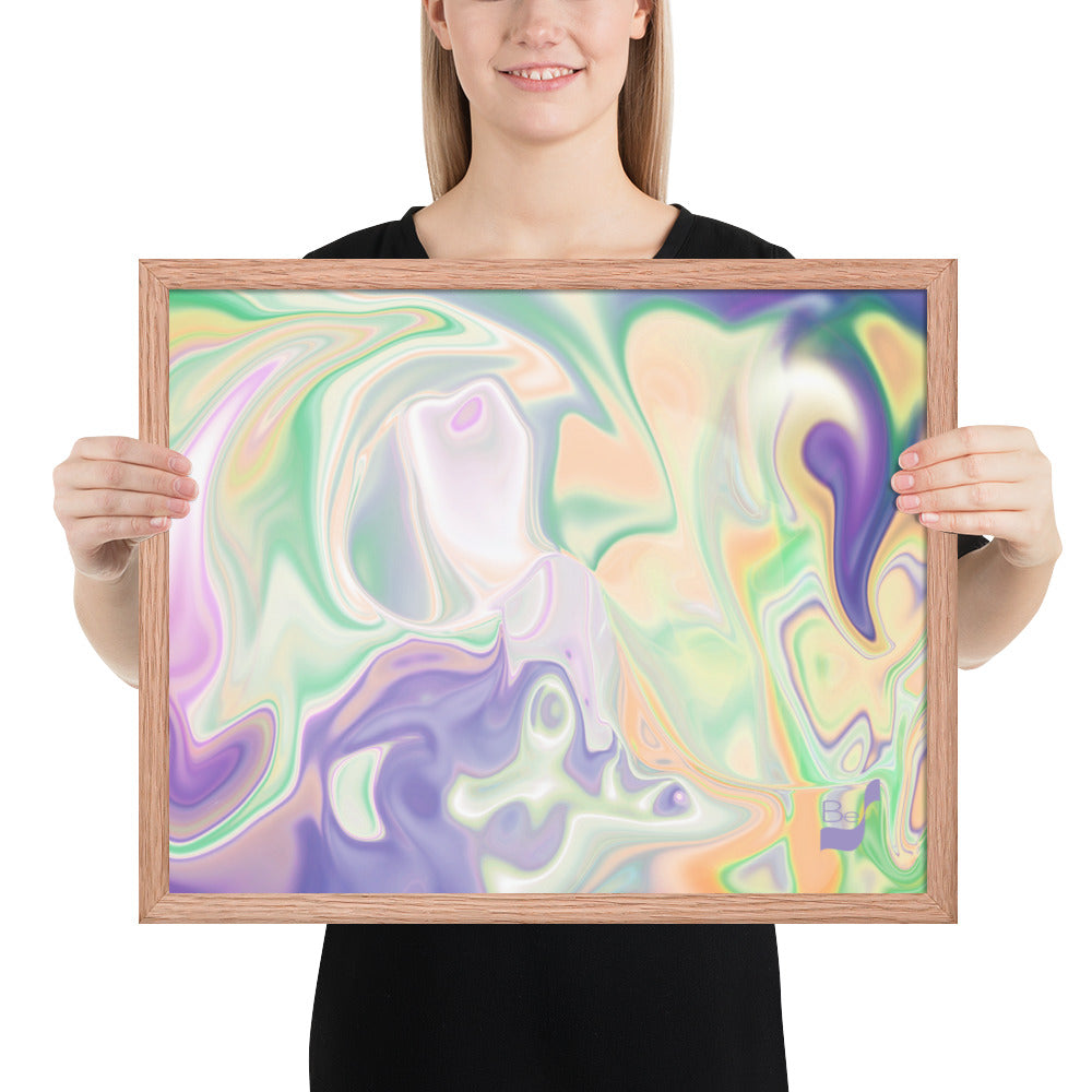 Enhance the allure of your home décor with this beautifully framed abstract art.  The heart of this stunning artwork lies in its captivating combination of colors. Ranging from soothing pastels to rich and deep tones, the colors beautifully intertwine with each other, creating an awe-inspiring visual feast. The carefully chosen colors – African Violet, Emerald, Green, Lavender, Light Green, Light Orange, Light Teal, Purple, and White – harmoniously dance together, elevating the ambiance of any room.