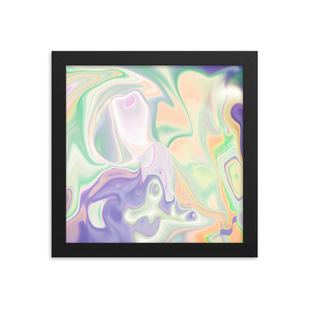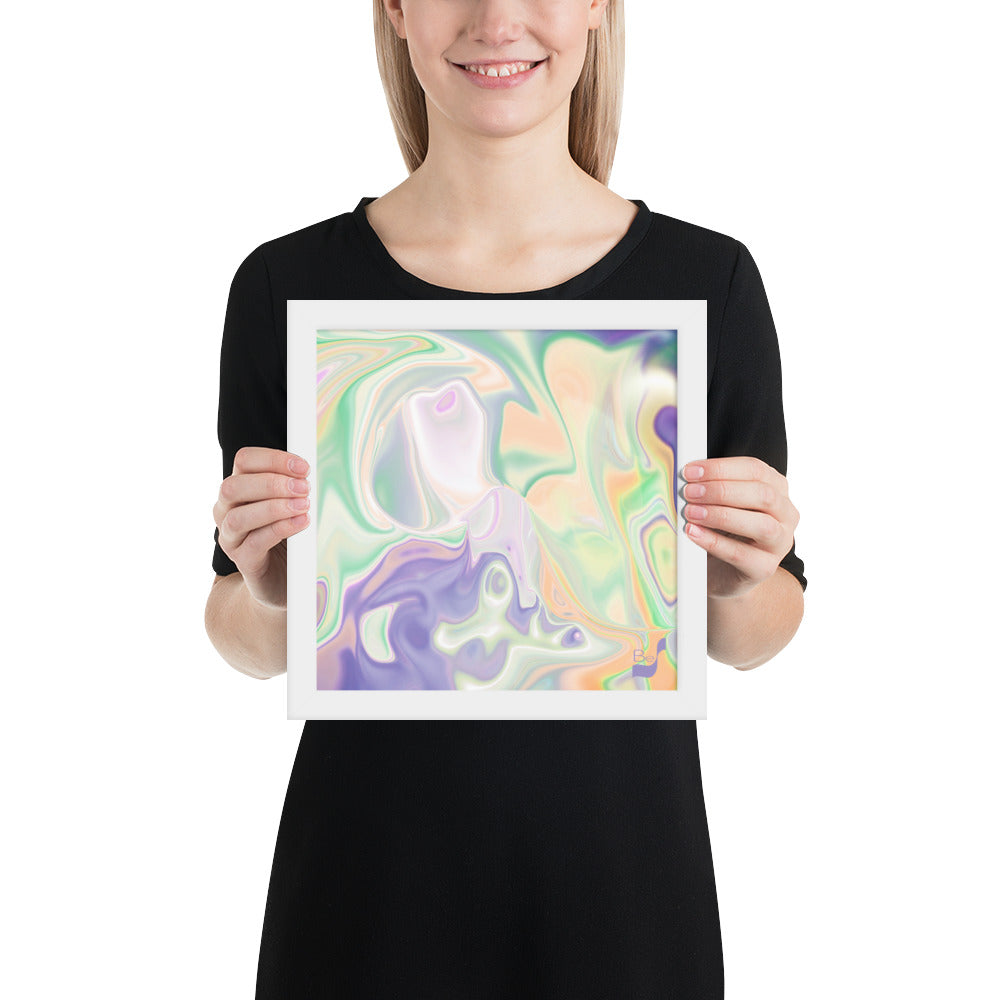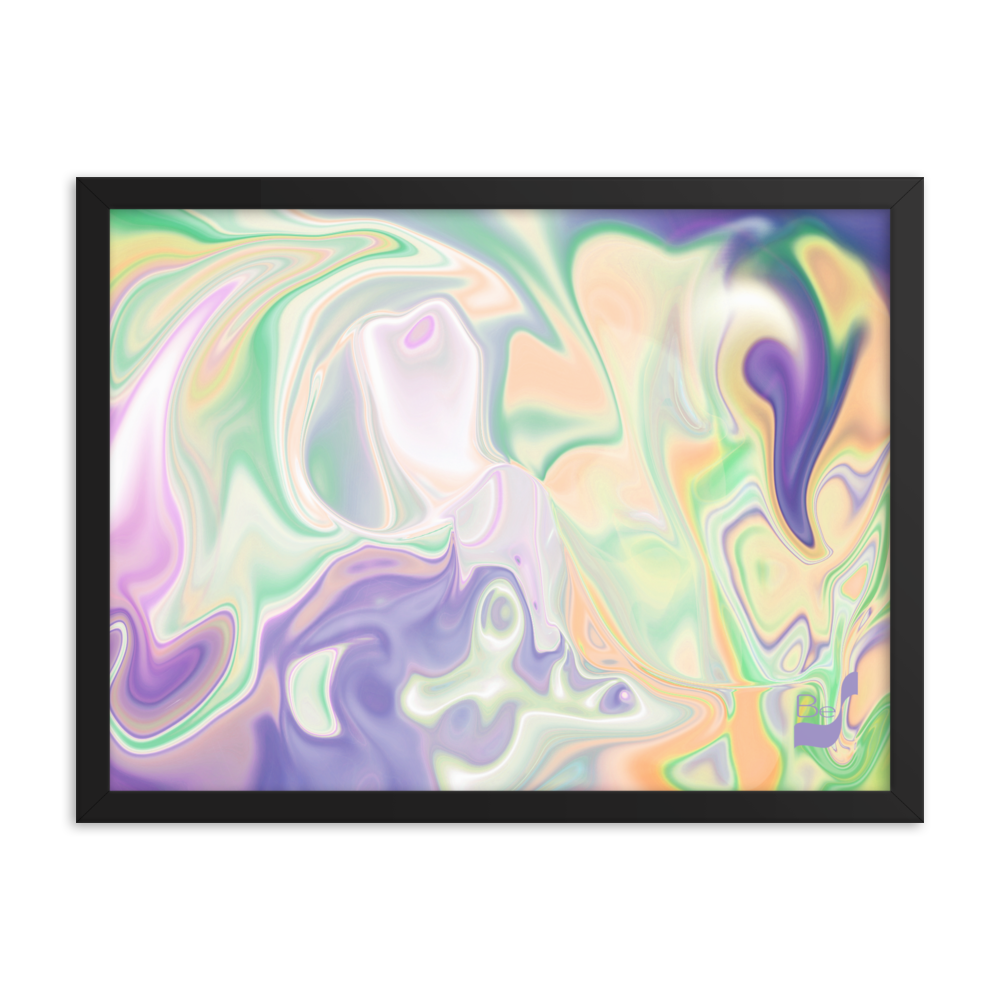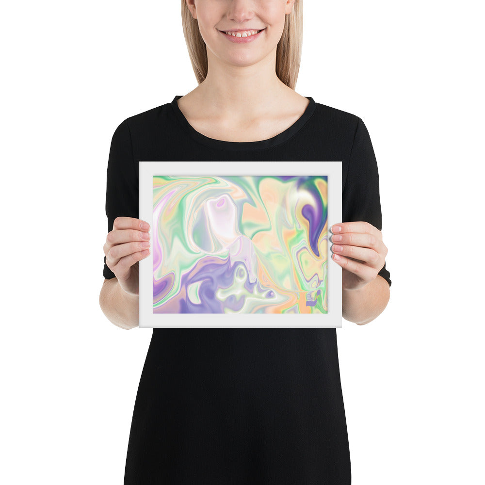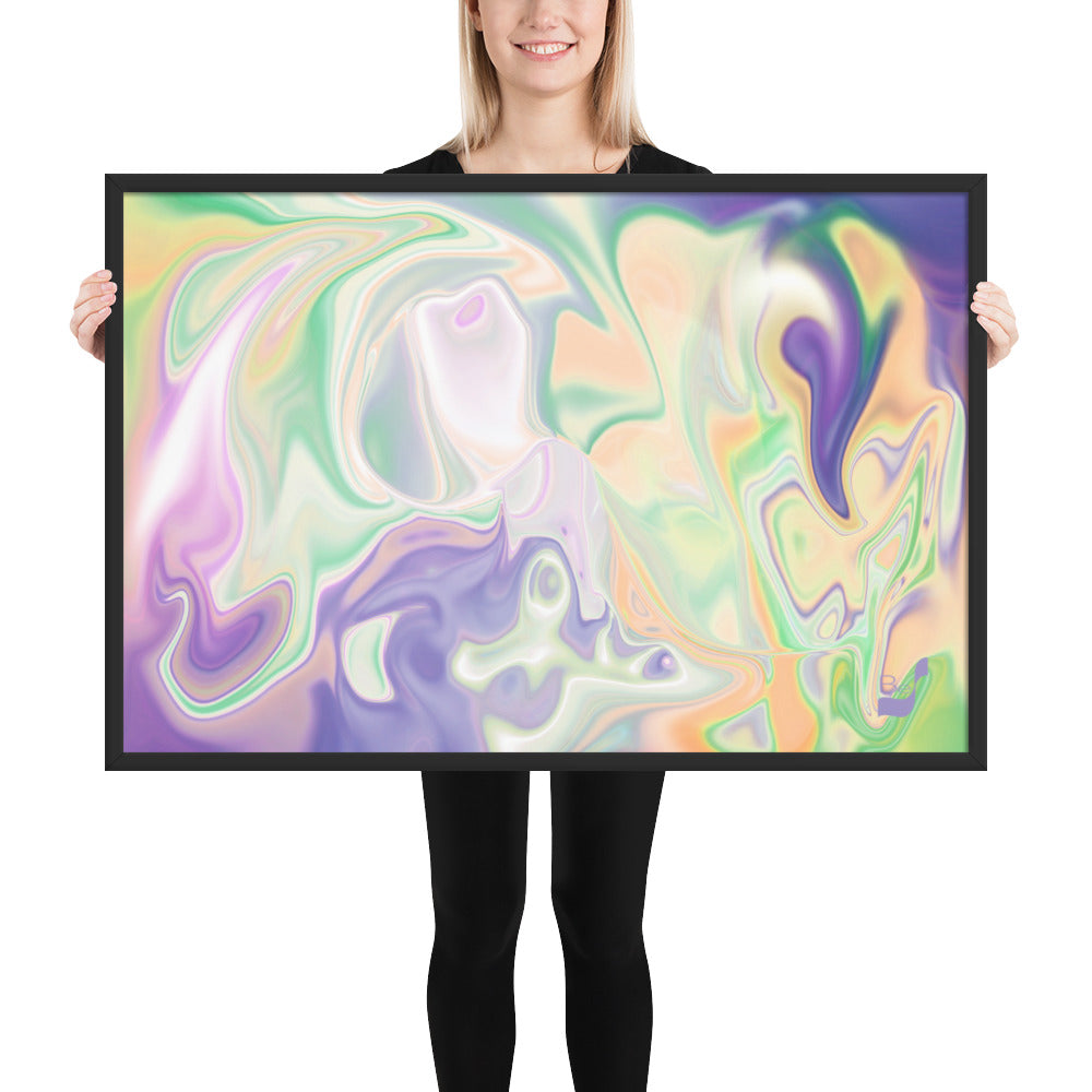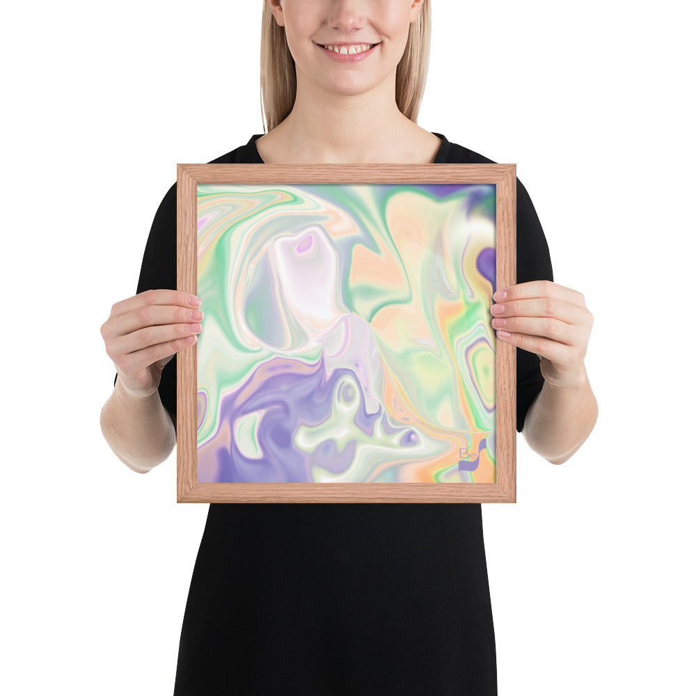 Enhance the allure of your home décor with this beautifully framed abstract art.  The heart of this stunning artwork lies in its captivating combination of colors. Ranging from soothing pastels to rich and deep tones, the colors beautifully intertwine with each other, creating an awe-inspiring visual feast. The carefully chosen colors – African Violet, Emerald, Green, Lavender, Light Green, Light Orange, Light Teal, Purple, and White – harmoniously dance together, elevating the ambiance of any room.