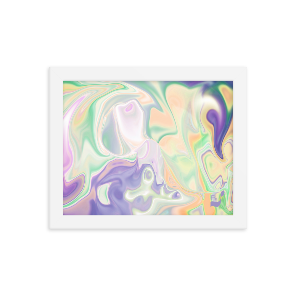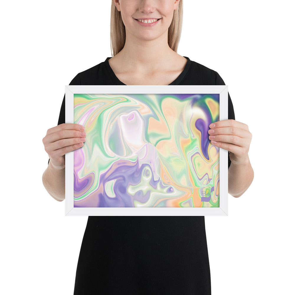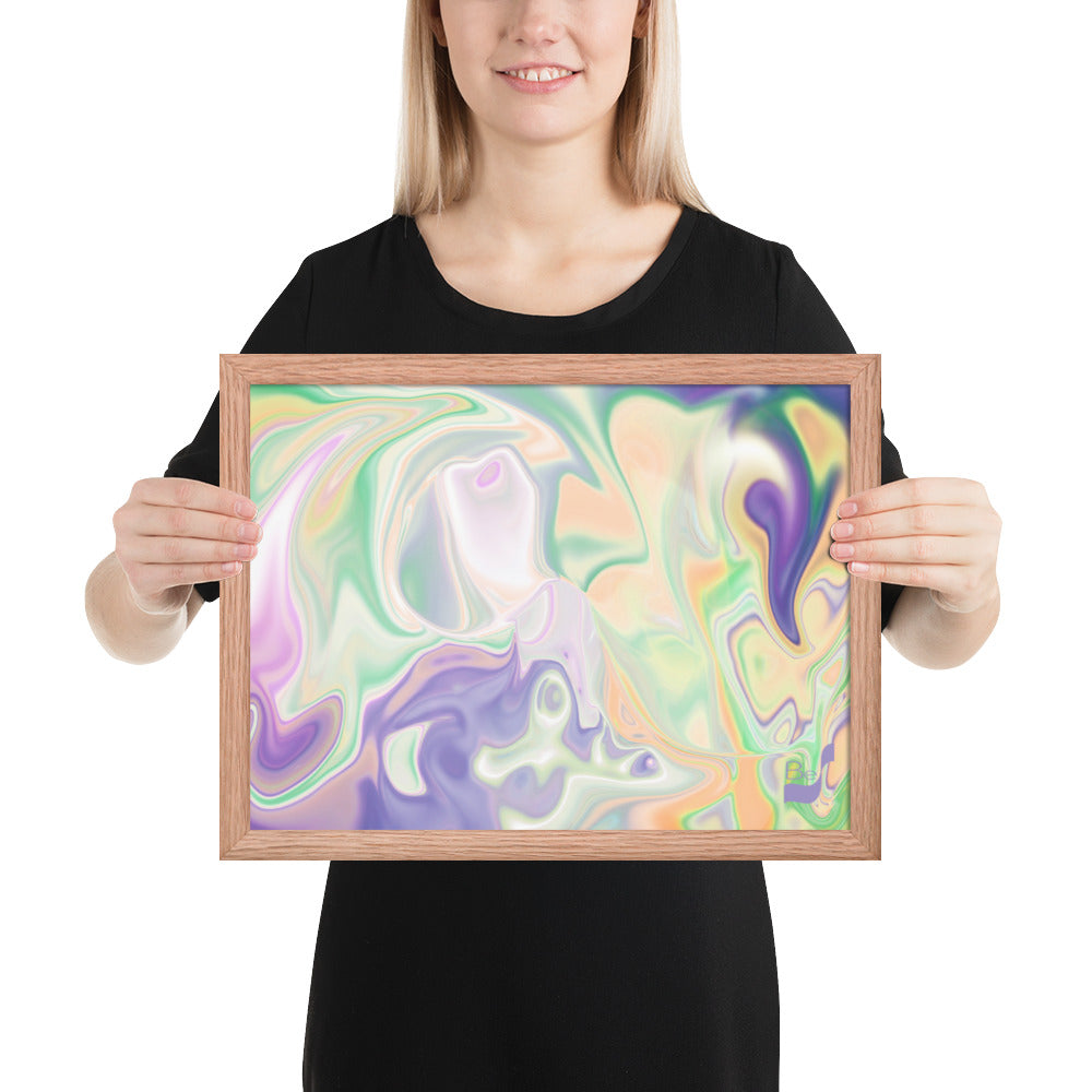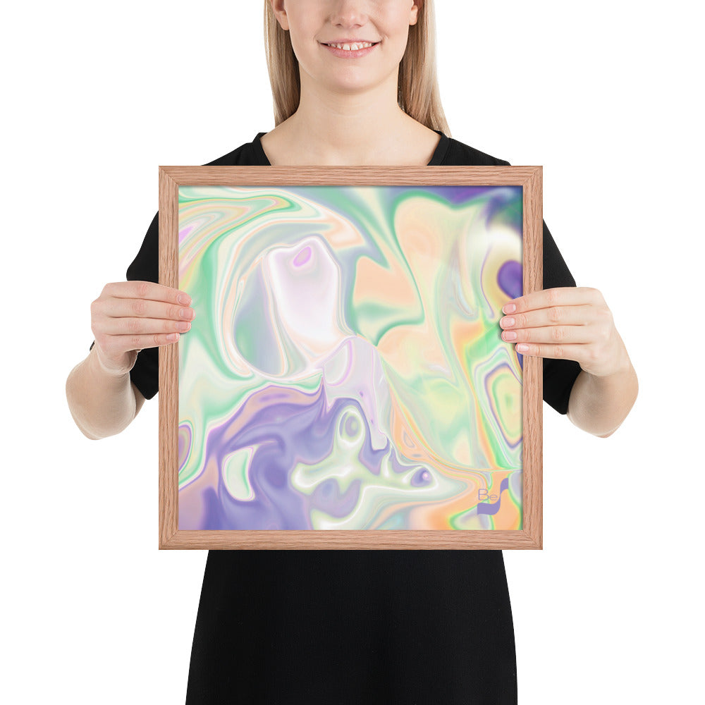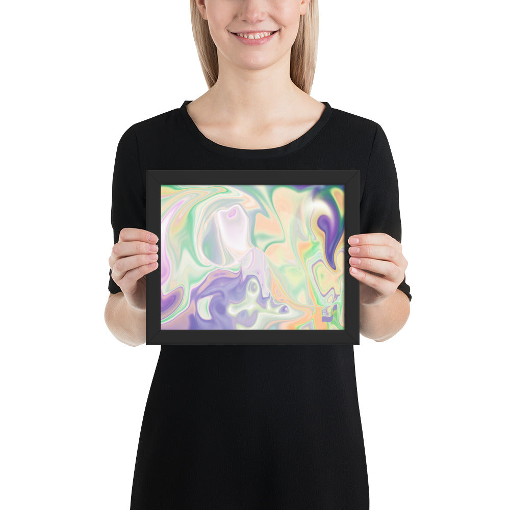 Enhance the allure of your home décor with this beautifully framed abstract art.  The heart of this stunning artwork lies in its captivating combination of colors. Ranging from soothing pastels to rich and deep tones, the colors beautifully intertwine with each other, creating an awe-inspiring visual feast. The carefully chosen colors – African Violet, Emerald, Green, Lavender, Light Green, Light Orange, Light Teal, Purple, and White – harmoniously dance together, elevating the ambiance of any room.