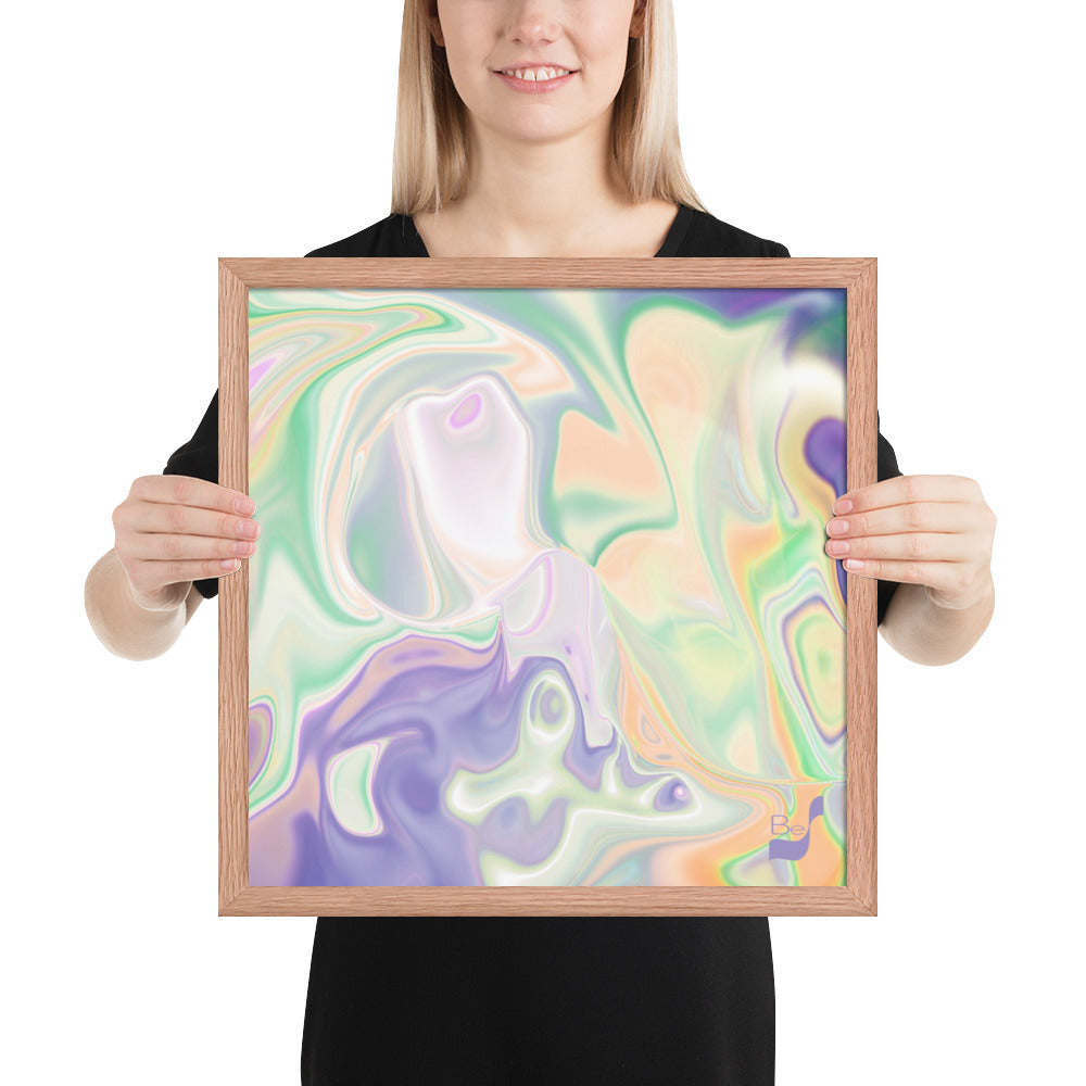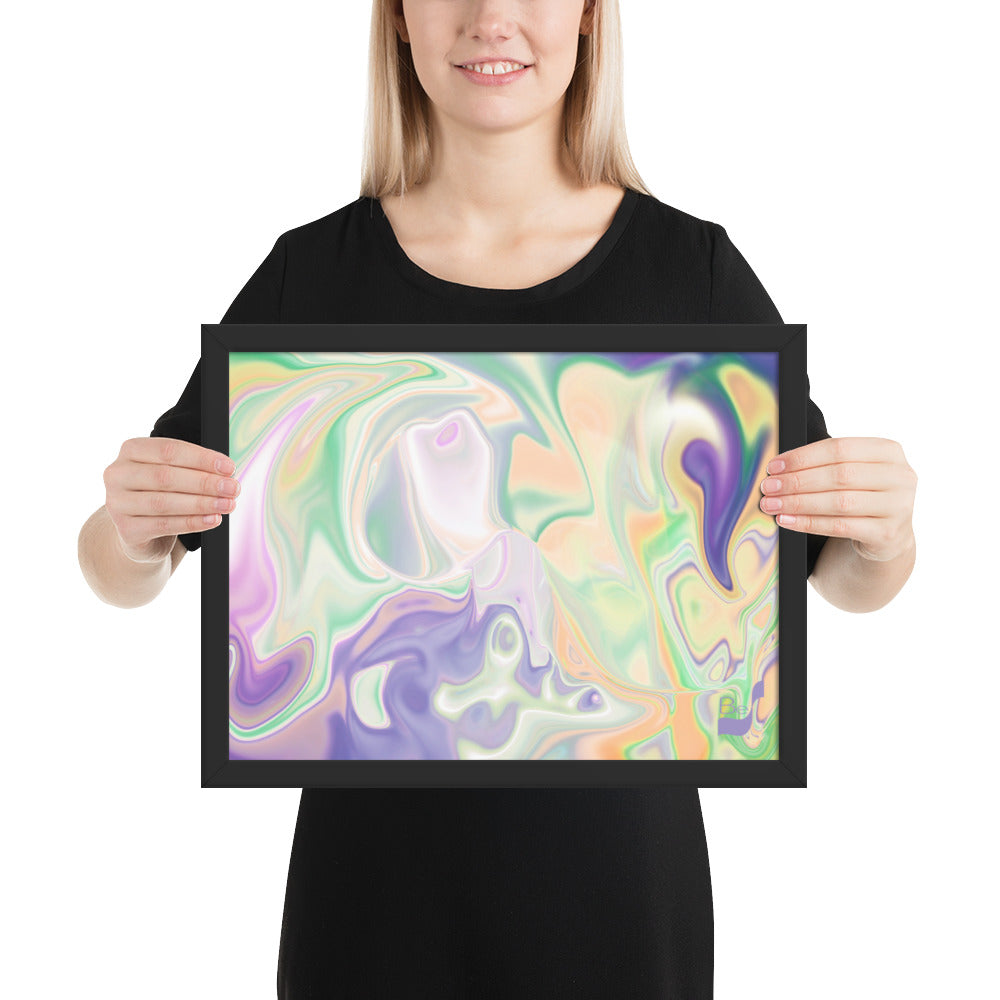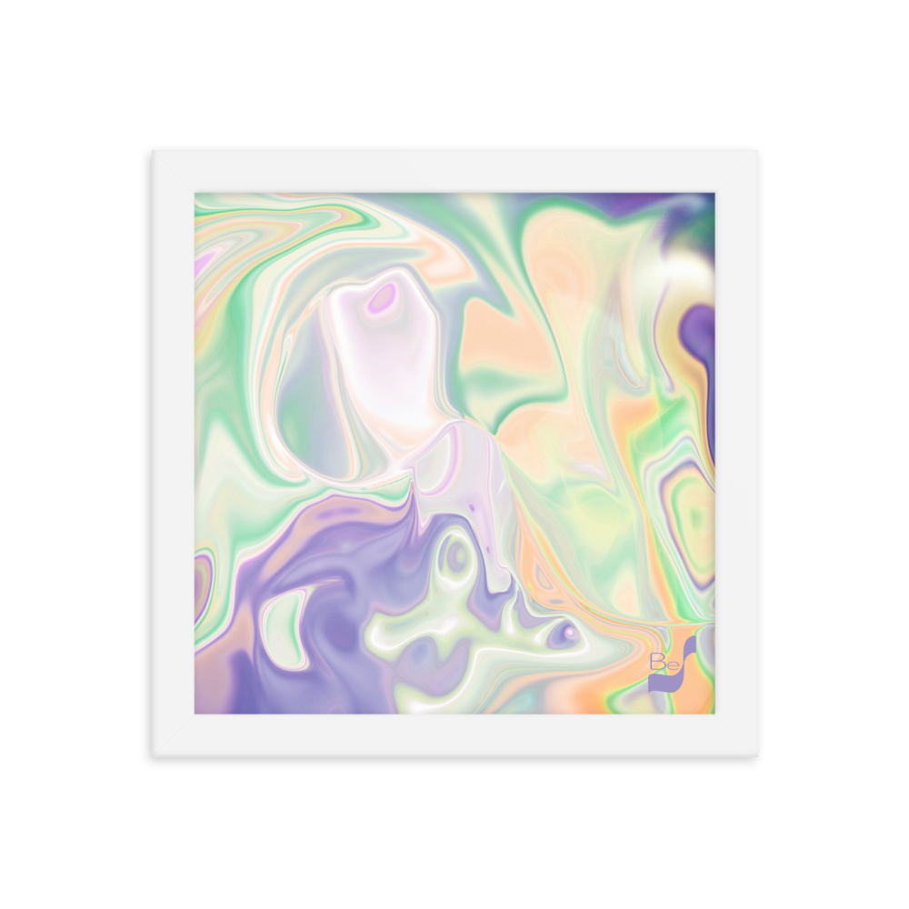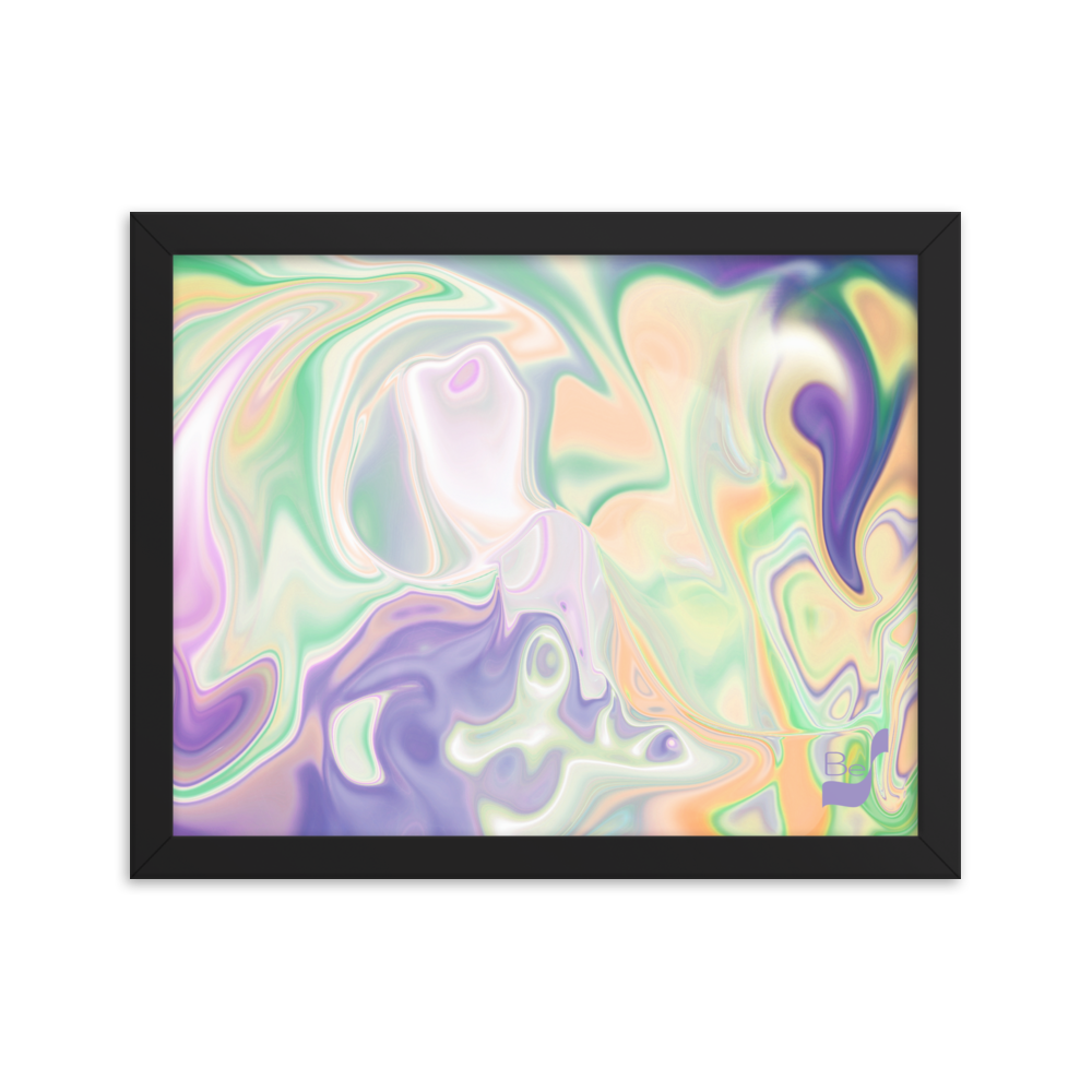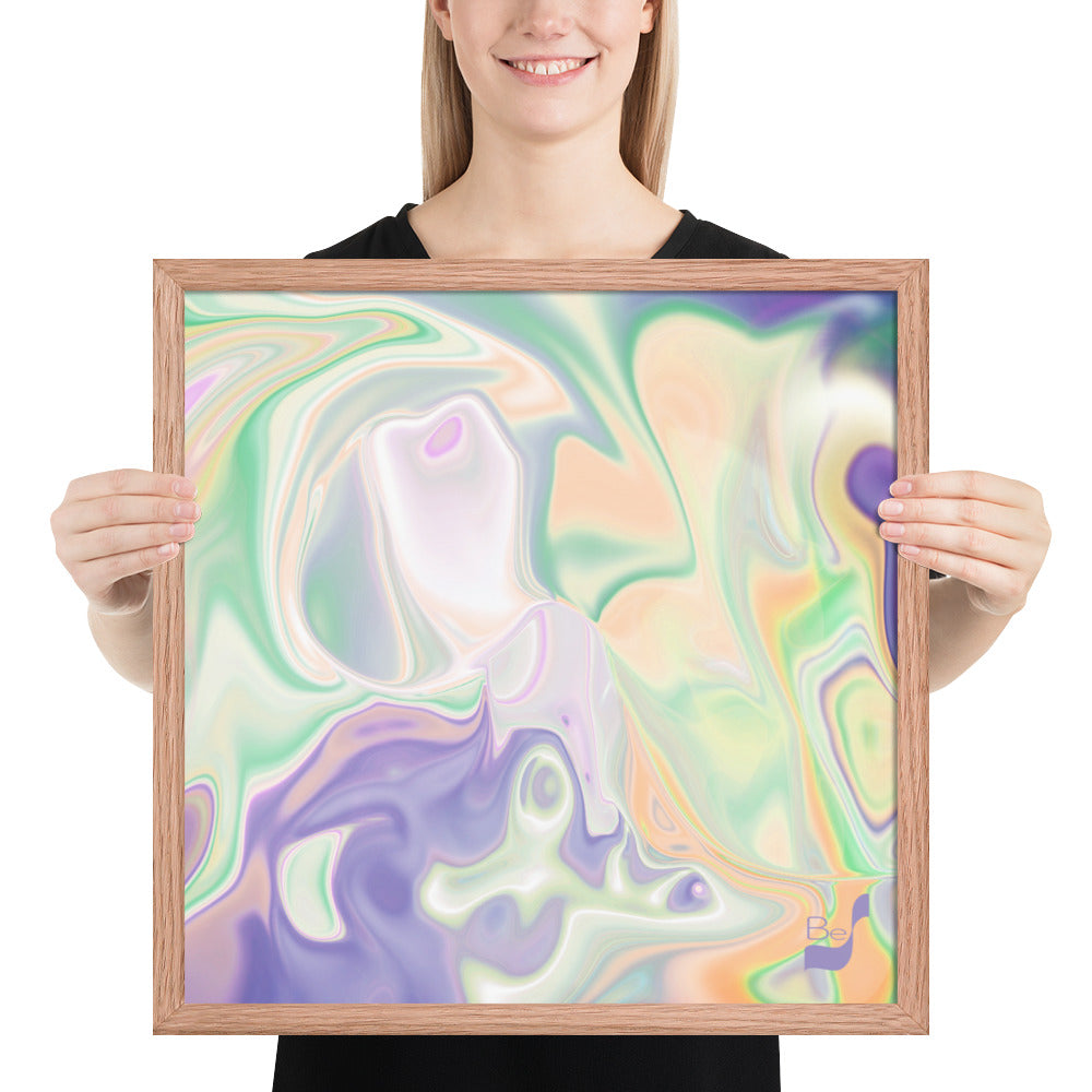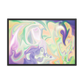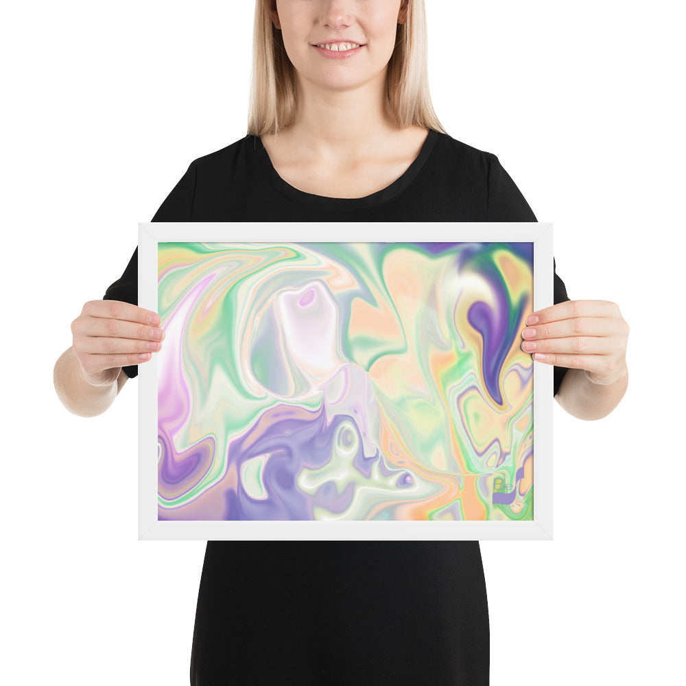 Enhance the allure of your home décor with this beautifully framed abstract art.  The heart of this stunning artwork lies in its captivating combination of colors. Ranging from soothing pastels to rich and deep tones, the colors beautifully intertwine with each other, creating an awe-inspiring visual feast. The carefully chosen colors – African Violet, Emerald, Green, Lavender, Light Green, Light Orange, Light Teal, Purple, and White – harmoniously dance together, elevating the ambiance of any room.
