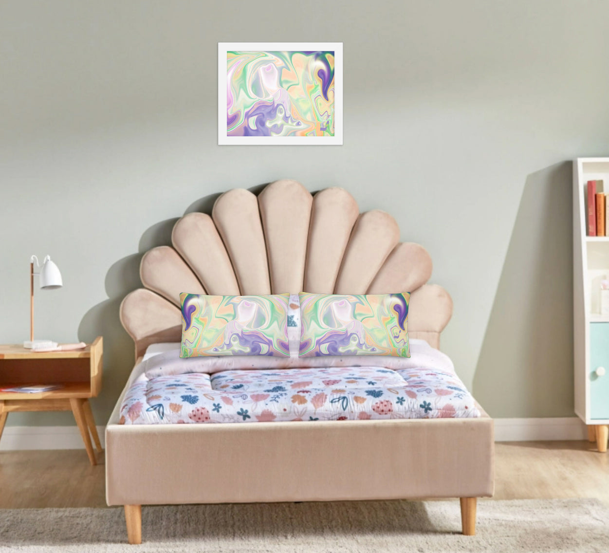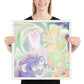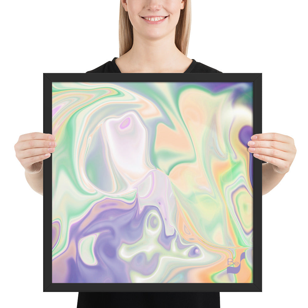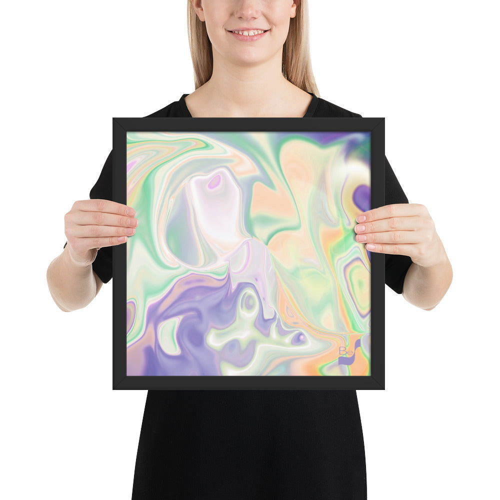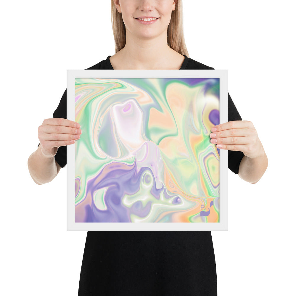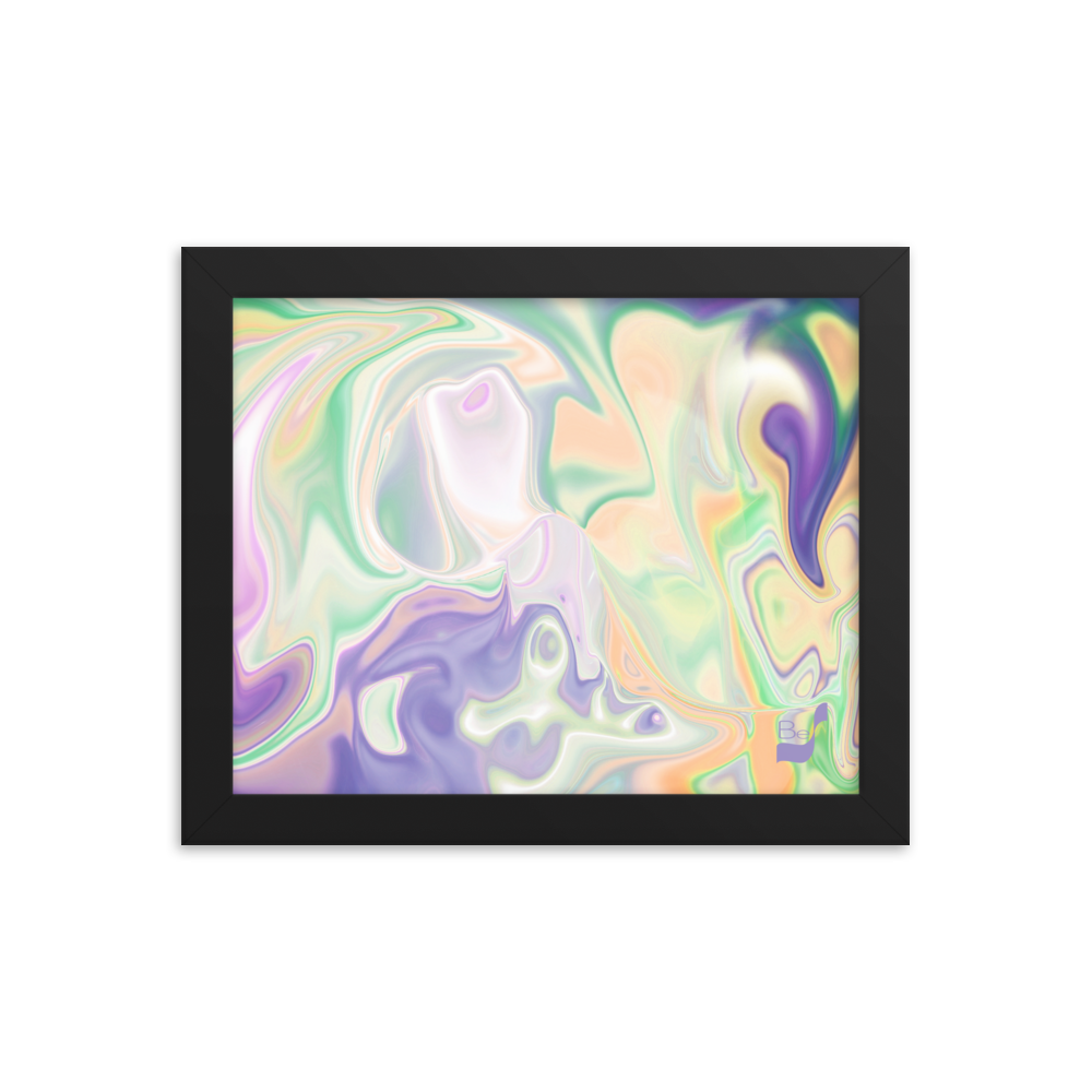 Enhance the allure of your home décor with this beautifully framed abstract art.  The heart of this stunning artwork lies in its captivating combination of colors. Ranging from soothing pastels to rich and deep tones, the colors beautifully intertwine with each other, creating an awe-inspiring visual feast. The carefully chosen colors – African Violet, Emerald, Green, Lavender, Light Green, Light Orange, Light Teal, Purple, and White – harmoniously dance together, elevating the ambiance of any room.