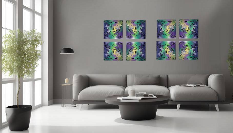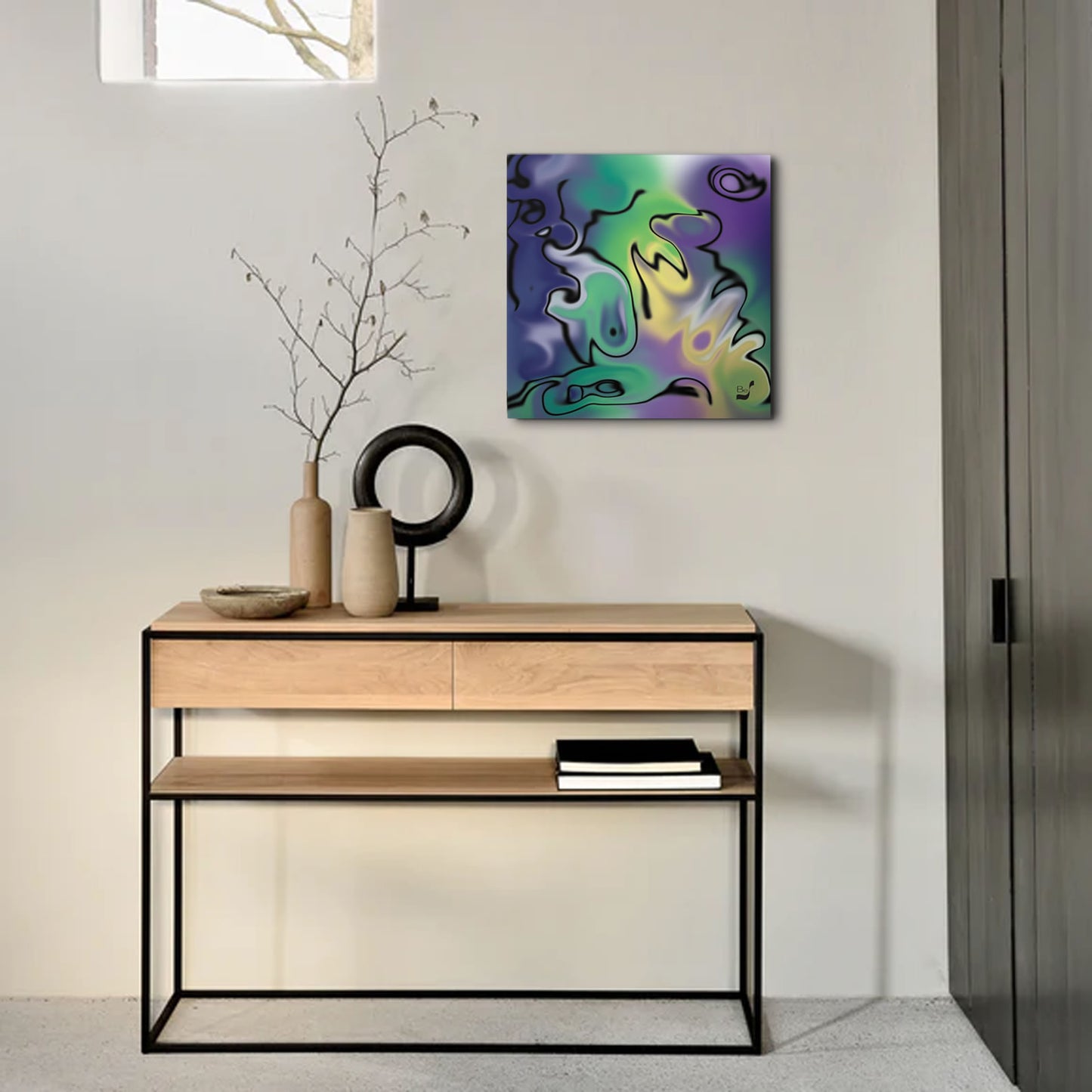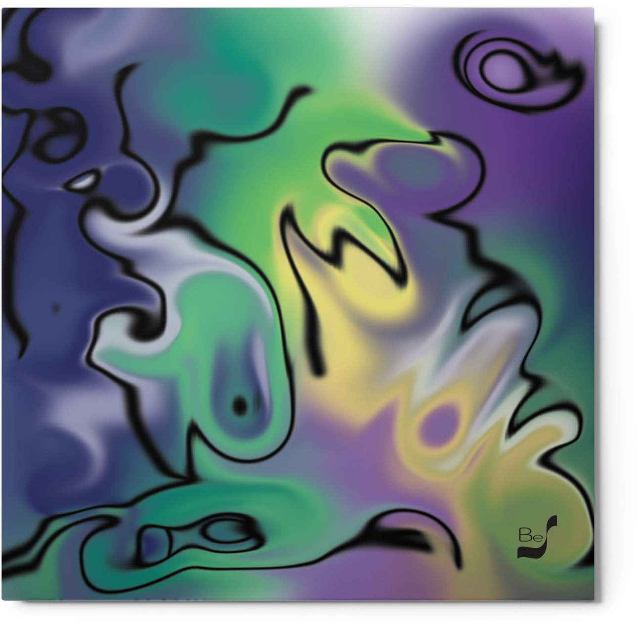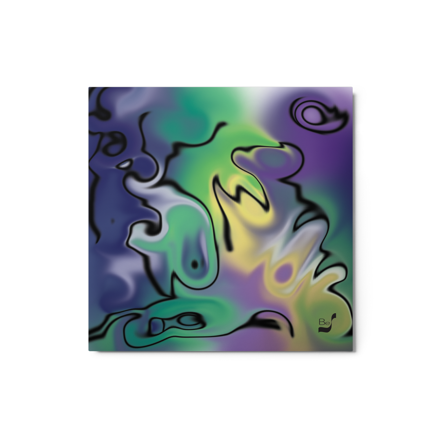 Discover the allure of Masquerade BeSculpt Abstract Wall Art on Metal Square. Its fluidity and seamless blend of colors create a captivating dance of elegance, with Emerald, Indigo, Light Yellow, Purple, and White harmoniously accented by defining black lines.