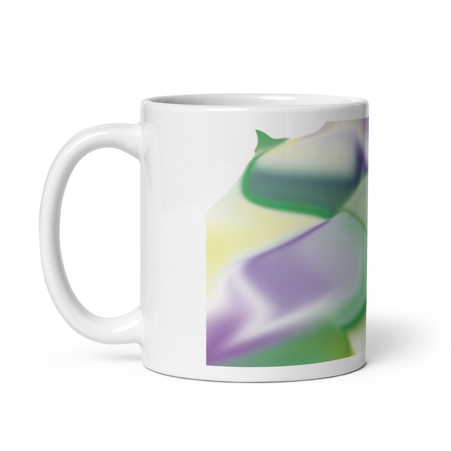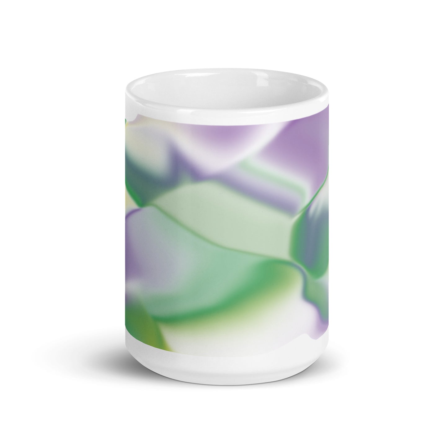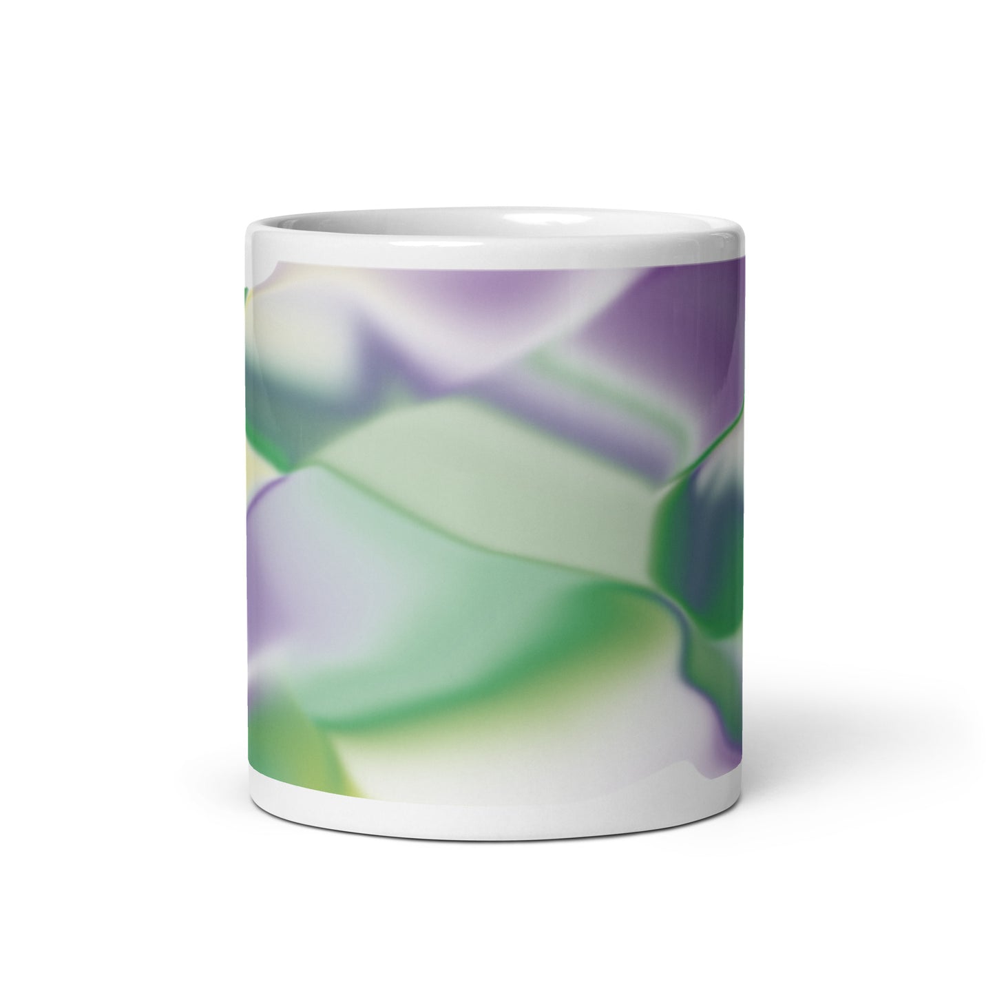 The Ribbons Green BeSculpt Abstract Artwork Mug showcases an abstract art piece that beautifully captures the graceful fluidity of ribbons gently swaying in the wind, their movements intertwining in a mesmerizing dance. The artistry skillfully depicts this elegant phenomenon, employing a delicate palette of soft hues, including Green, Purple, Beige, Yellow, and White, to evoke a profound sense of tranquil beauty.