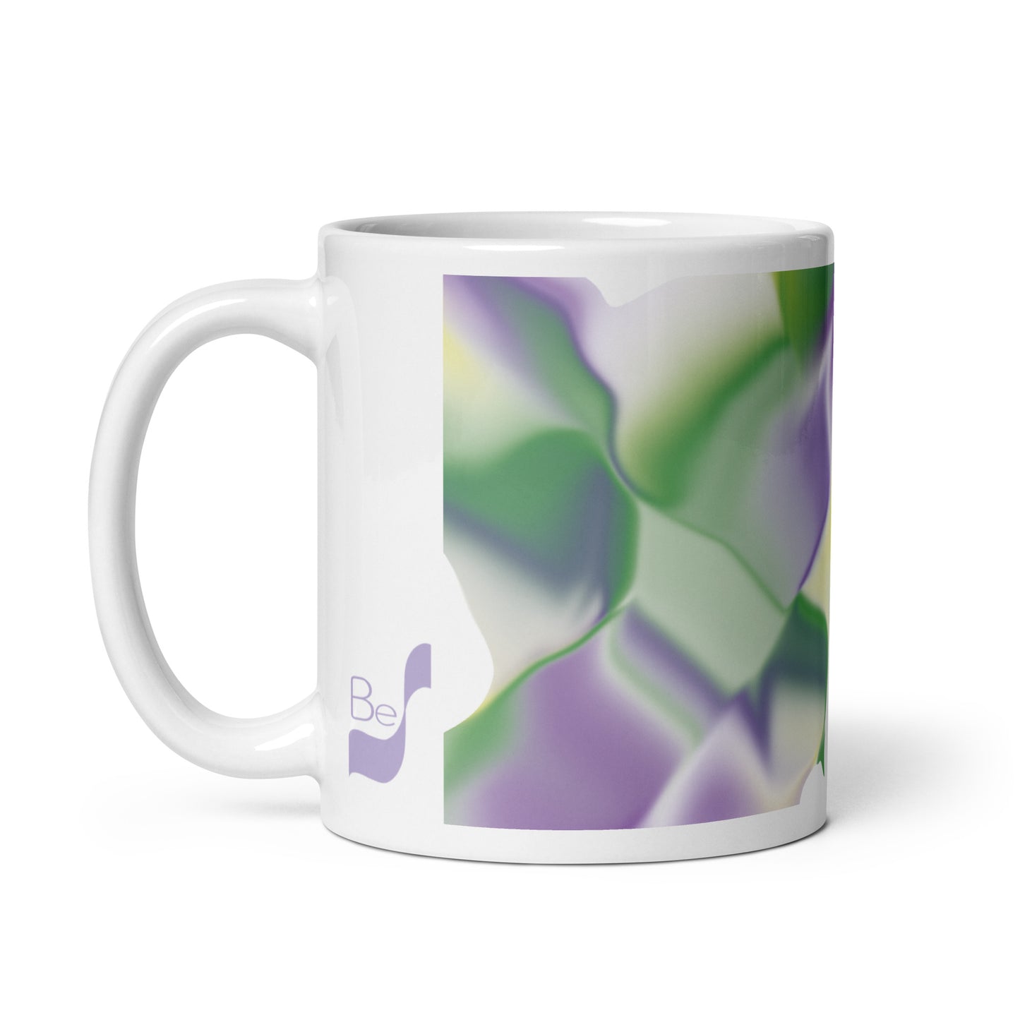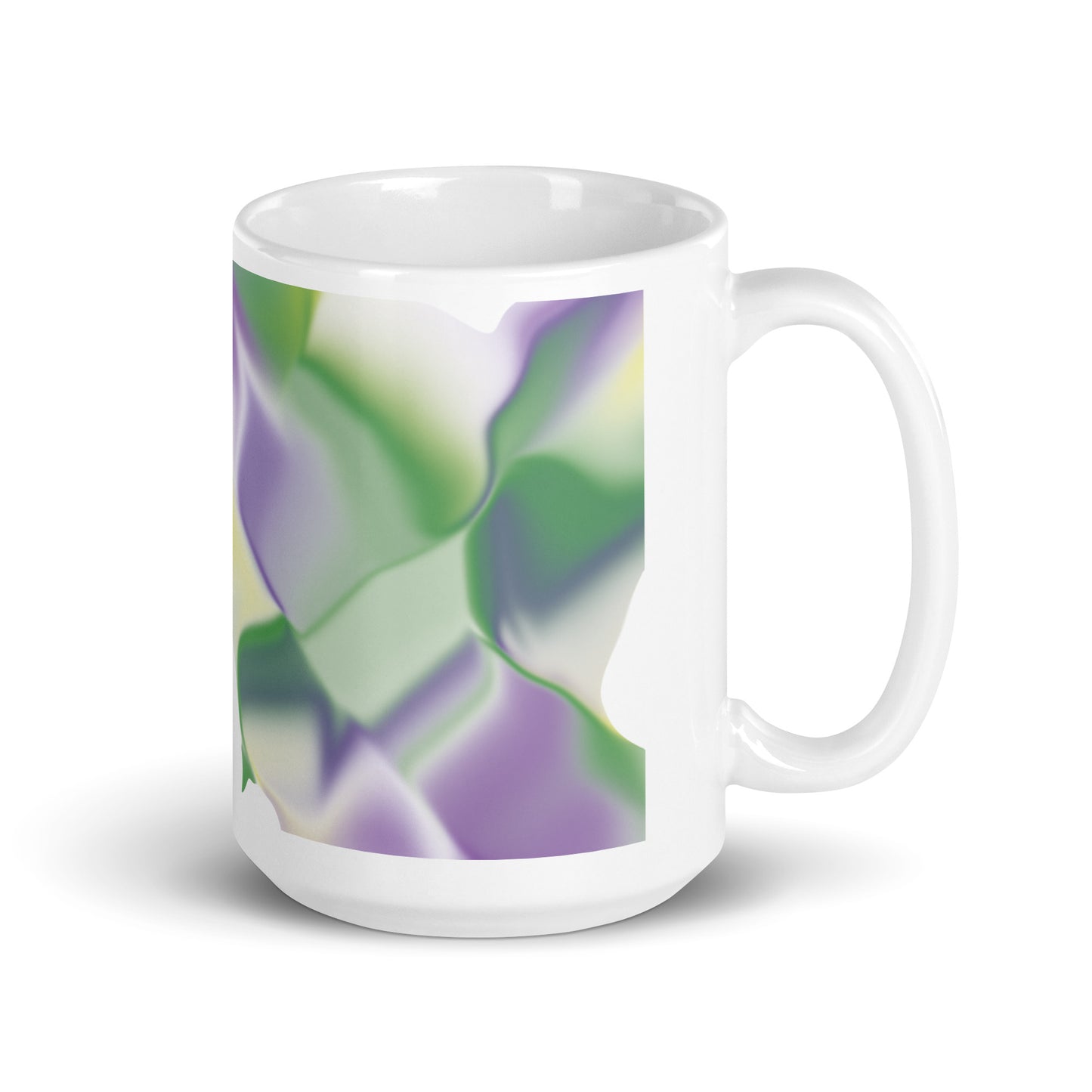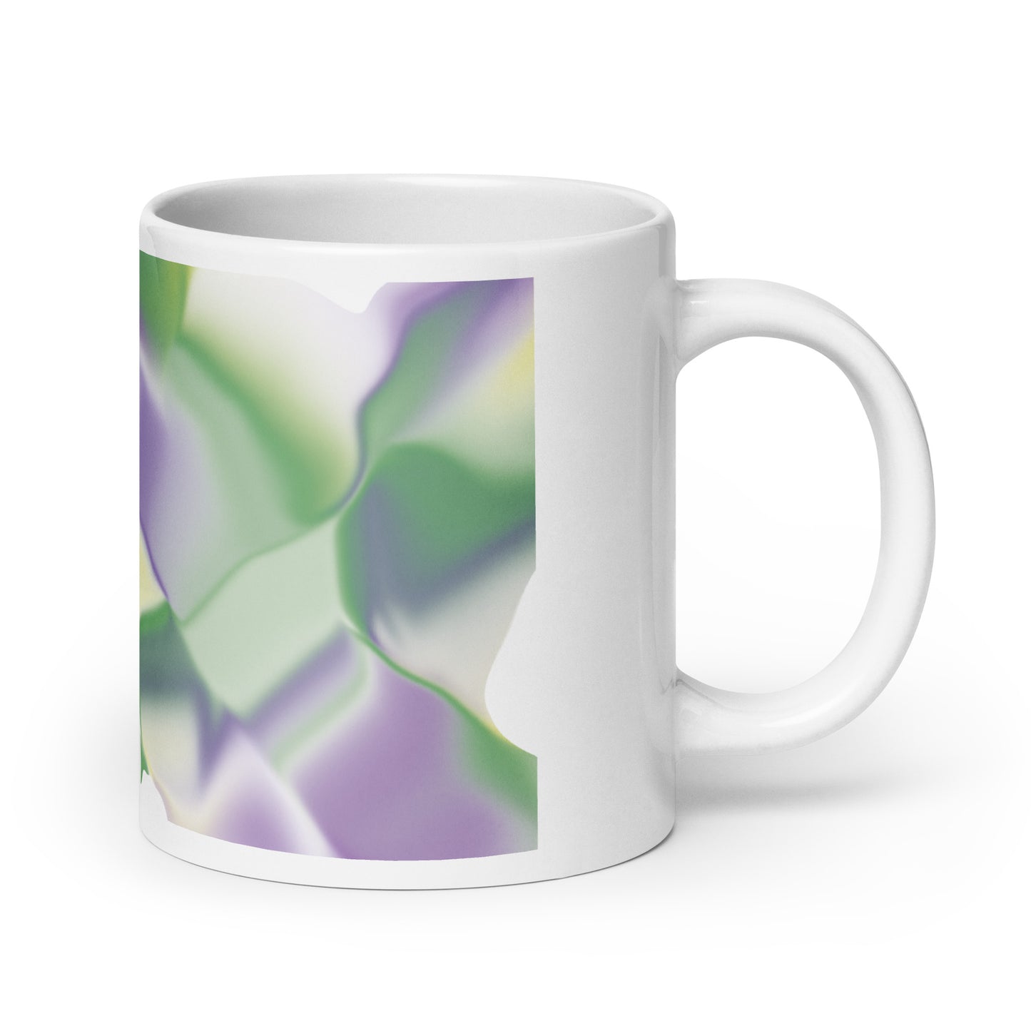 As you cradle this ceramic masterpiece in your hands, the fluid dance of ribbons comes alive in a dynamic kaleidoscope of colors. The original Ribbons Green image, artfully combined with its reversed counterpart, creates a captivating visual symphony, featuring hues of Green, Purple, Beige, Yellow, and White. Each brushstroke contributes to the intricate pattern, evoking a sense of tranquility and harmonious beauty.
