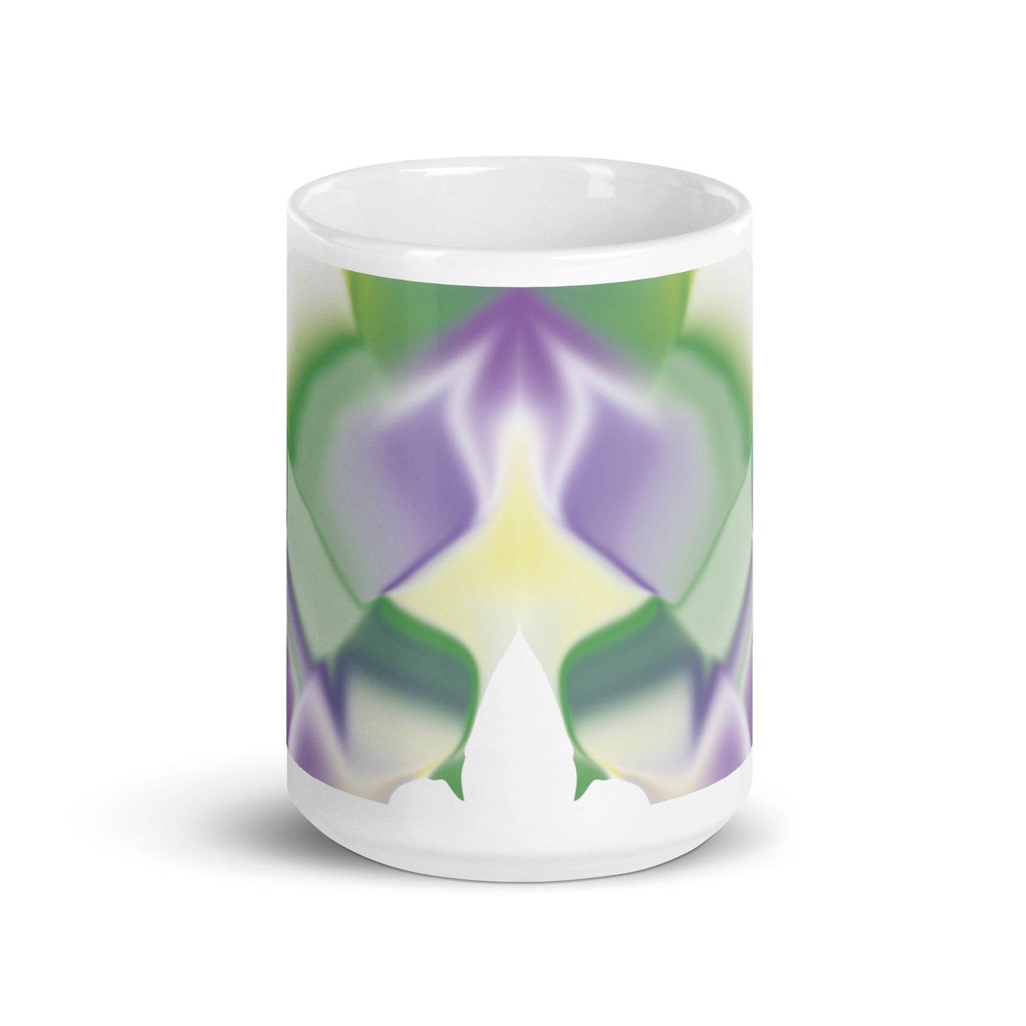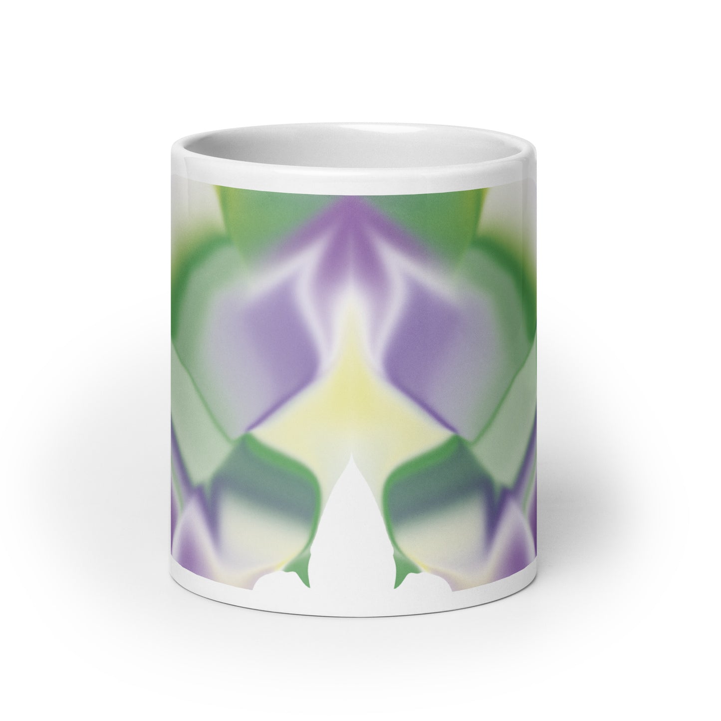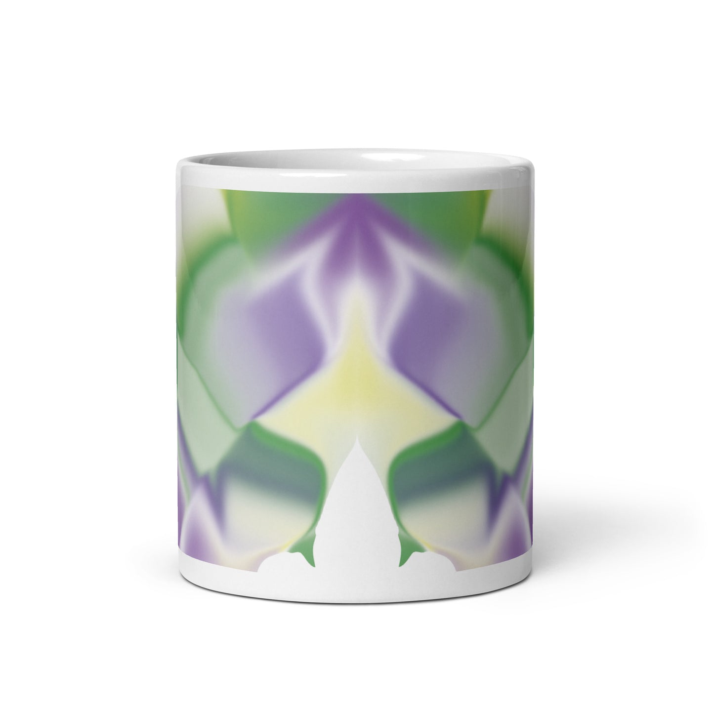 As you cradle this ceramic masterpiece in your hands, the fluid dance of ribbons comes alive in a dynamic kaleidoscope of colors. The original Ribbons Green image, artfully combined with its reversed counterpart, creates a captivating visual symphony, featuring hues of Green, Purple, Beige, Yellow, and White. Each brushstroke contributes to the intricate pattern, evoking a sense of tranquility and harmonious beauty.