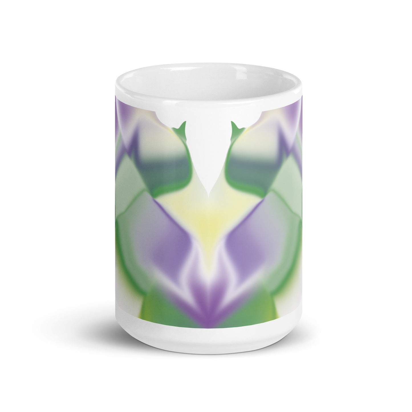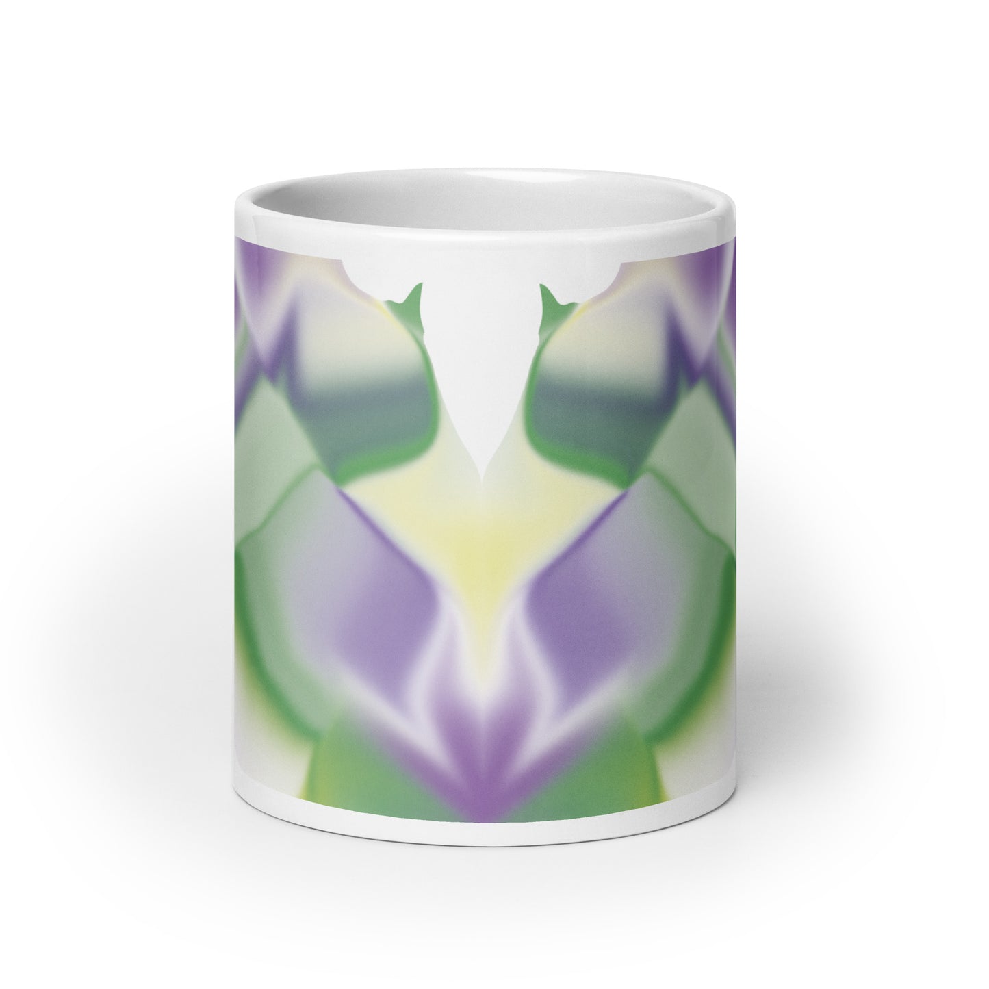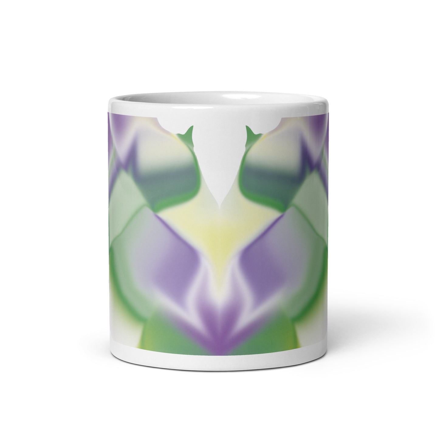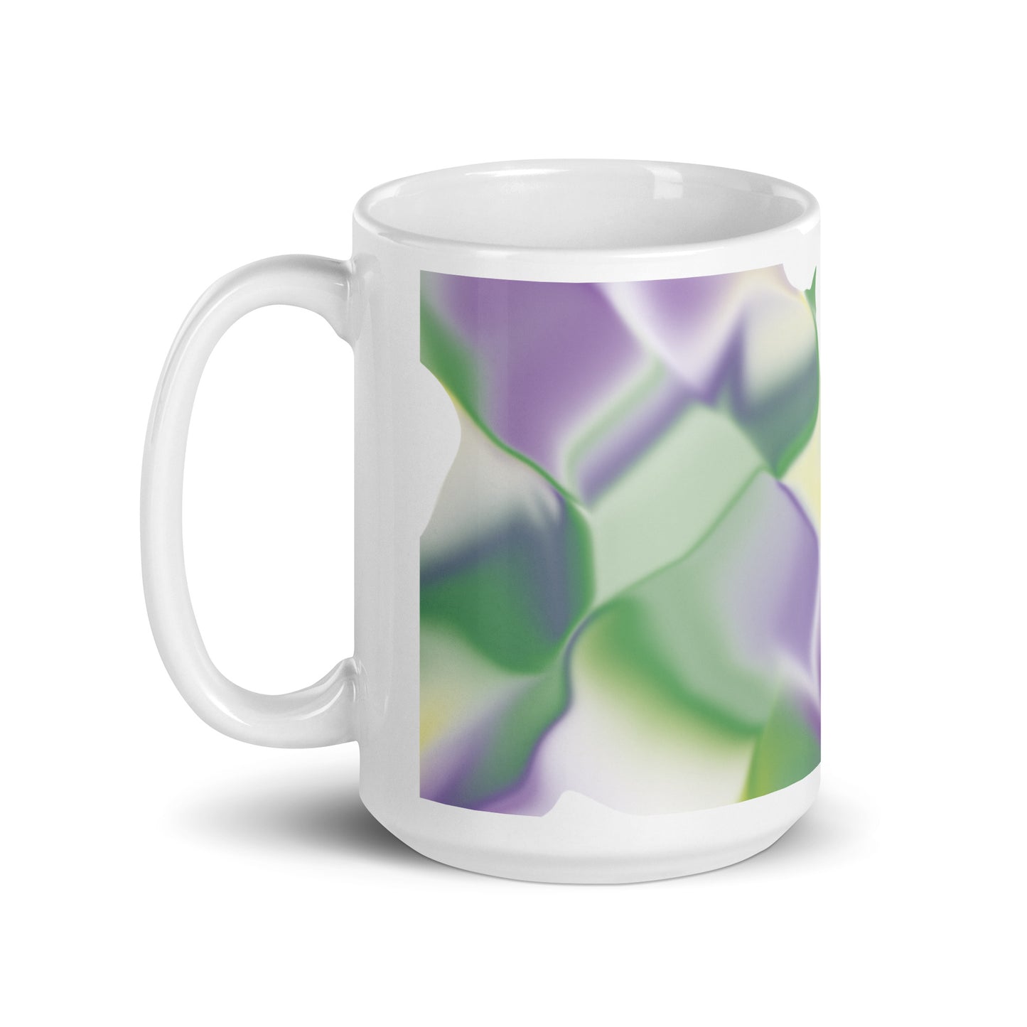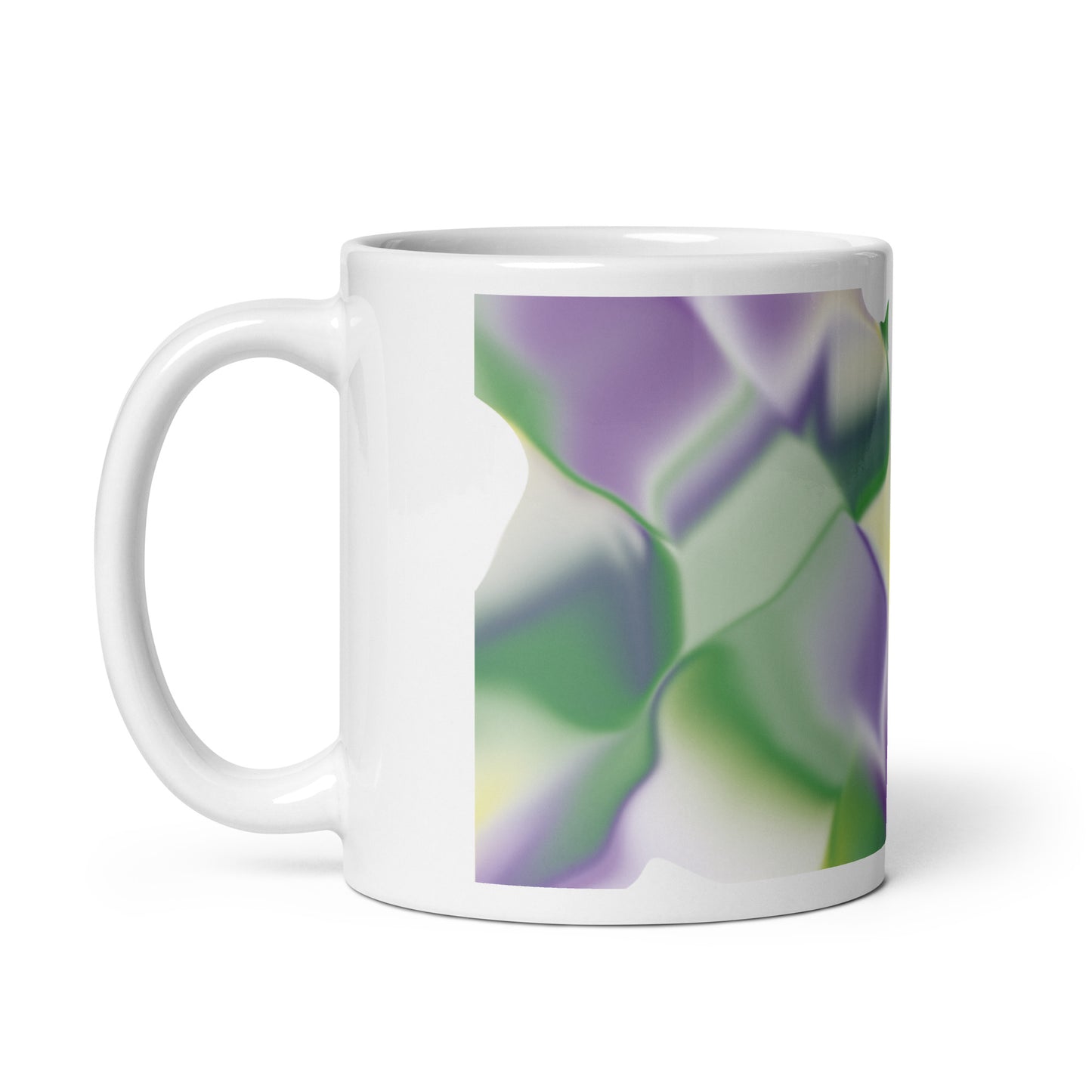 As you hold this exquisite mug, the gentle sway of ribbons comes to life in a dynamic dance of colors, creating a visual symphony of Green, Purple, Beige, Yellow, and White. The intricate kaleidoscope effect adds depth and vibrancy to the art, offering a unique and immersive experience with every sip.