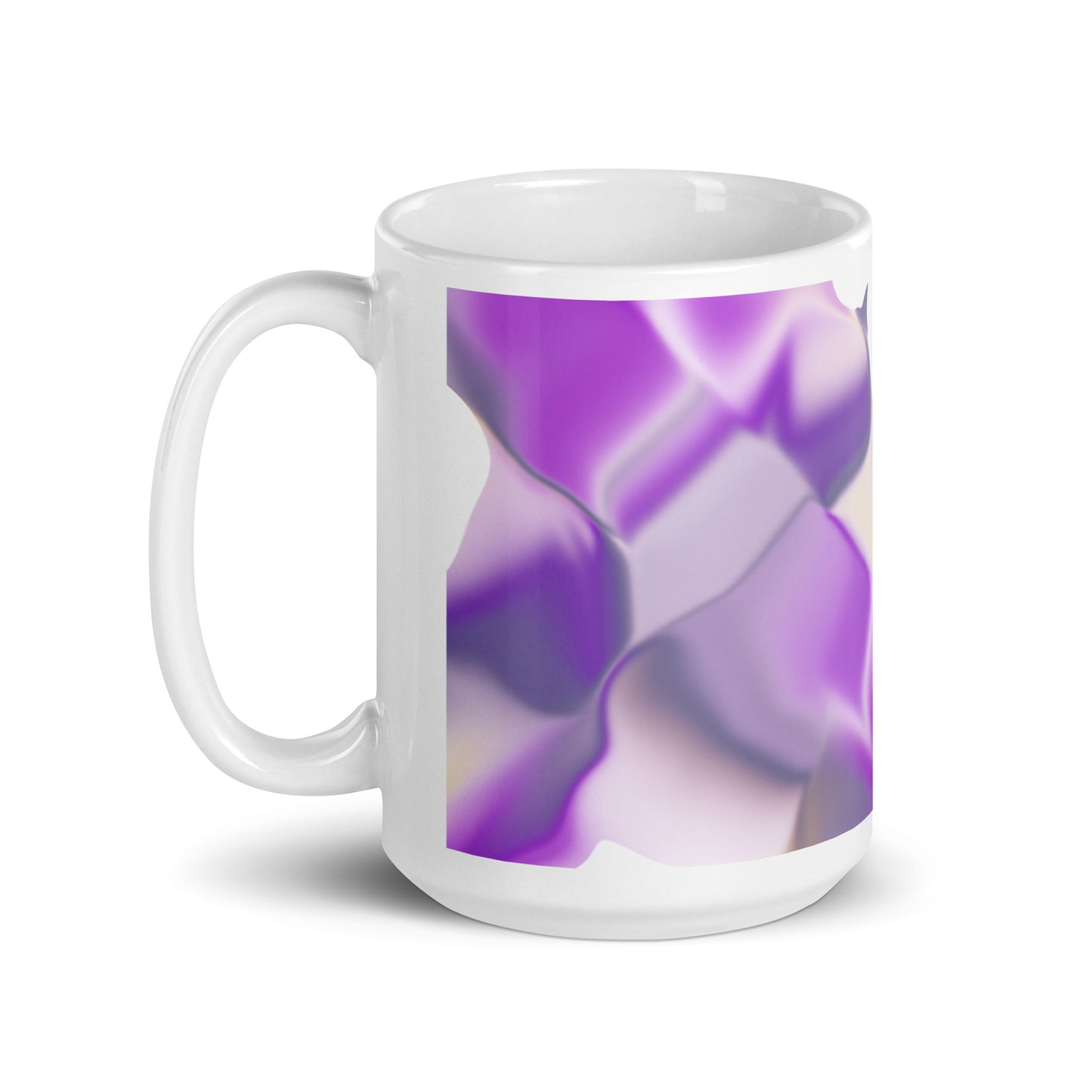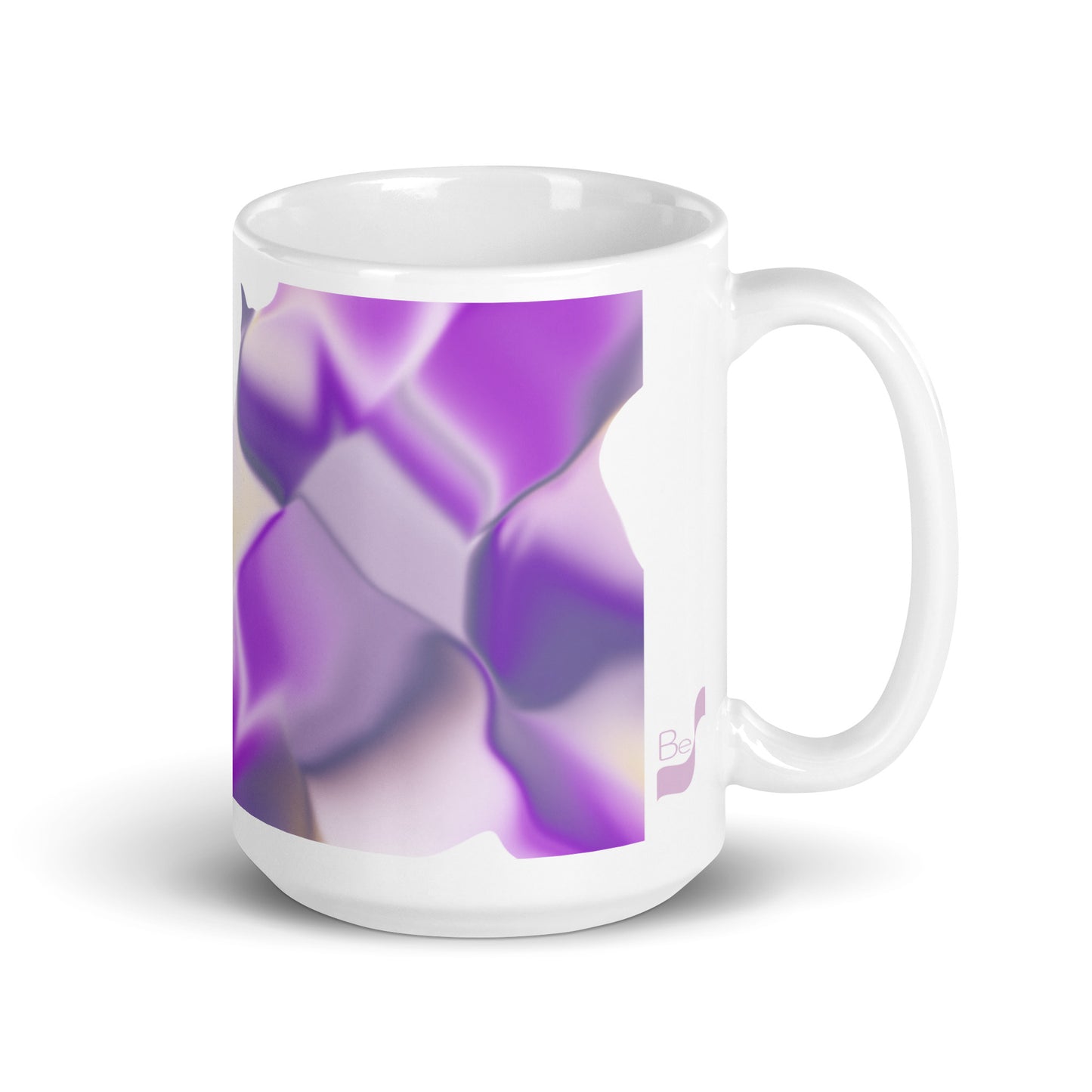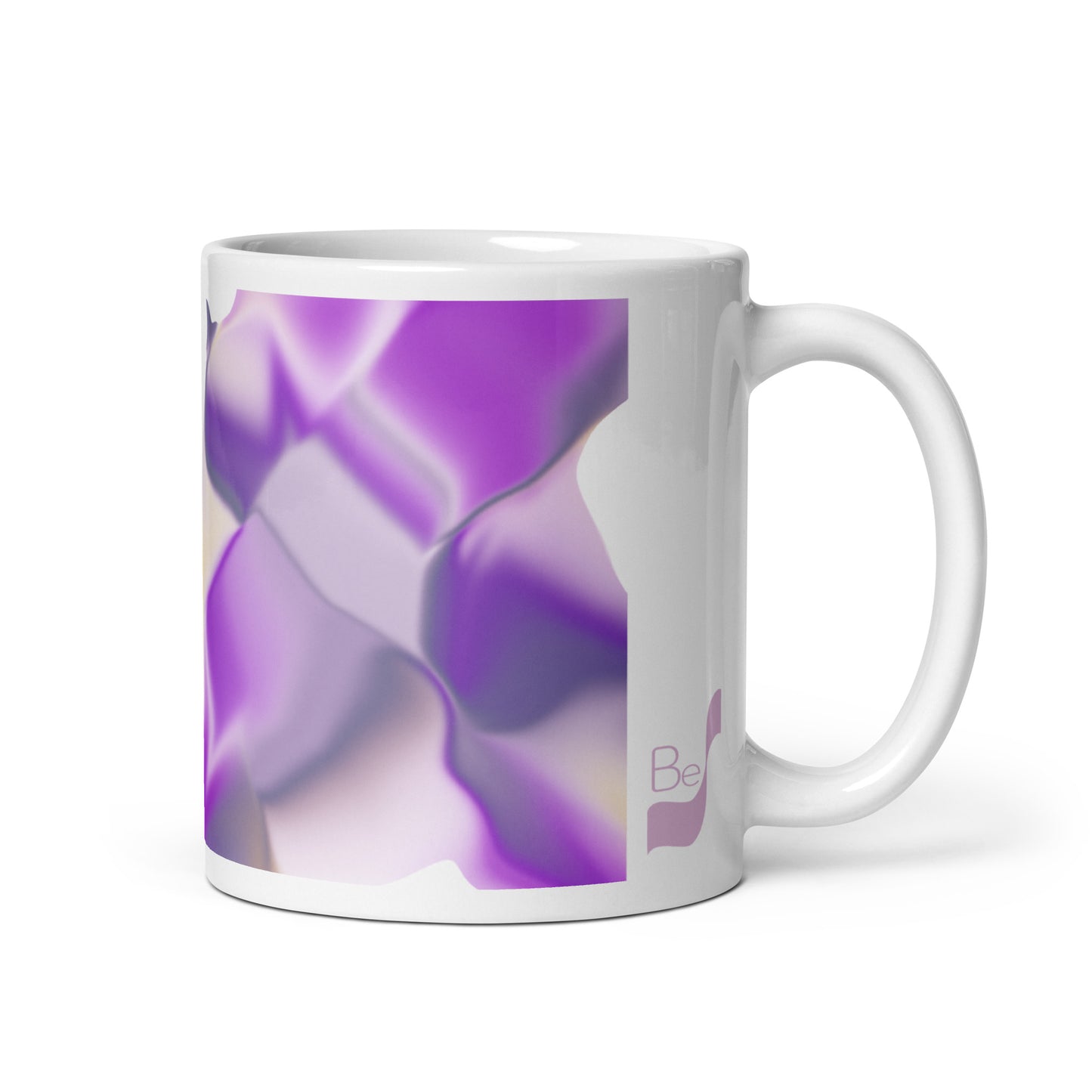 The Ribbons Purple BeSculpt Abstract Artwork Kaleidoscope Mug 3 is more than just a vessel; it is a canvas for inspiration. The vivid glossy print, seamlessly marrying the original and reversed images, ensures both visual allure and practicality, being microwave and dishwasher safe.